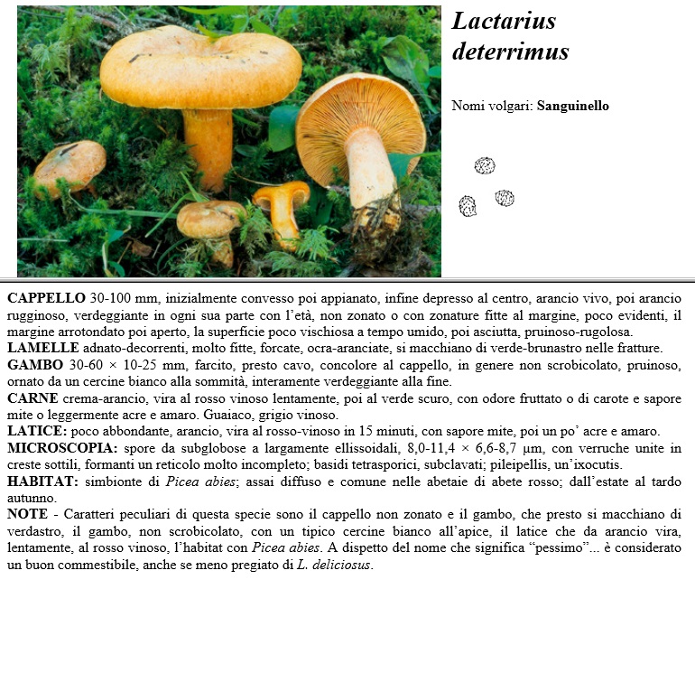 CAPPELLO 30-100 mm, inizialmente convesso poi appianato, infine depresso al centro, arancio vivo, poi arancio rugginoso, cerdesgiante in ogni sua parte con l'età, non zonato o con zonature fitte al margine, poco evidenti, il margine arrotondato poi aperto, la superficie poco vischiosa a tempo umido, poi asciutta, pruinoso-rugolosa. LAMELLE adnato-decorrenti, molto fitte, forcate, ocra-aranciate, si macchiano di verde-brunastro nelle fratture. GAMBO 30-60 x 10-25 mm, farcito, presto cavo, concolore al cappello, in genere non scrobicolato, pruinoso, ornato da un cercine bianco alla sommità. interamente verdeggiante alla fine. CARNE crema-arancio, vira al rosso vinoso lentamente, poi al verde scuro, con odore fruttato o di carote e sapore mite o leggermente acre e amaro. Guaiaco, grigio vinoso. LATTICE poco abbondante, arancio, vira al rosso-vinoso in 15 minuti, con sapore mite, poi un po' acre e amaro. MICROSCOPIA spore da subglobose a largamente ellissoidali, 8,0-11,4 x 6,6-8,7 µm, con verruche unite in creste sottili, formanti un reticolo molto incompleto, basidi tetrasporici, subclavati, pileipellis, un'ixocutis. HABITAT simbionte di Picea abies, assai diffuso e comune nelle abetaie di abete rosso, dall'estate al tardo autunno. NOTE - Caratteri peculiari di questa specie sono il cappello non zonato e il gambo, che presto si macchiano di cerdastro, il gambo, non scrobicolato, con un tipico cercine bianco all'apice, il lattice che da arancio cira, lentamente, al rosso vinoso, l'habitat con Picea abies. A dispetto del nome che significa "pessimo", è considerato un buon commestibile, anche se meno pregiato di L. deliciosus.