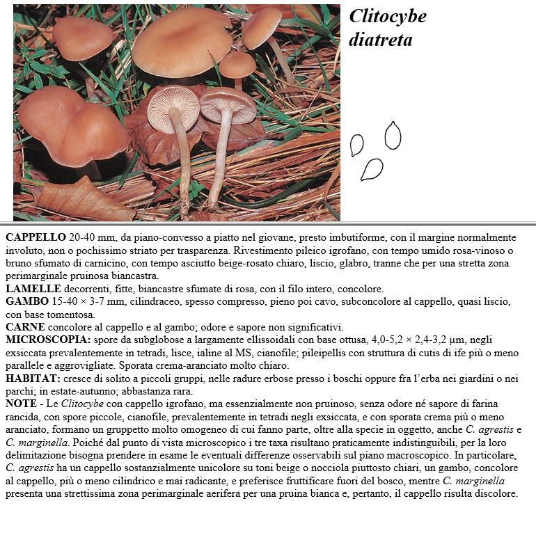 CAPPELLO 20-40 mm, da piano-convesso a piatto nel giovane, presto imbutiforme, con il margine normalmente involuto, non o pochissimo striato per trasparenza. Rivestimento pileico igrofano, con tempo umido rosa-vinoso o bruno sfumato di carnicino, con tempo asciutto beige-rosato chiaro, liscio, glabro, tranne che per una stretta zona perimarginale pruinosa biancastra. LAMELLE decorrenti, fitte, biancastre sfumate di rosa; con il filo intero, concolore. GAMBO 15-40 x 3-7 mm, cilindraceo, spesso compresso, pieno poi cavo, subconcolore al cappello, quasi liscio, con base tomentosa. CARNE concolore al cappello e al gambo; odore e sapore non significativi. MICROSCOPIA spore da subglobose a largamente ellissoidali con base ottusa, 4,0-5,2 x 2,4-3,2 µm, negli exsiccata prevalentemente in tetradi, lisce, ialine al MS, cianofile, pileipellis con struttura di cutis di ife più o meno parallele e aggrovigliate. Sporata crema-aranciato molto chiaro. HABITAT cresce di solito a piccoli gruppi, nelle radure erbose presso i boschi oppure fra l'erba nei giardini o nei parchi, in estate-autunno, abbastanza rara. NOTE - Le Clitocihe con cappello igrofano, ma essenzialmente non pruinoso, senza odore né sapore di farina ranada, con spore piccole, cianoflle, prevalentemente in tetradi negli exsiccata, e con sporata crema più o meno aranciato, formano un gruppetto molto omogeneo di cui fanno parte, oltre alla specie in oggetto, anche C. agrestis e C. marginella. Poiché dal punto di vista microscopico i tre taxa risultano praticamente indistinguibili, per la loro delimitazione bisogna prendere in esame le eventuali differenze osservabili sul piano macroscopico. In particolare, C. agrestis ha un cappello sostanzialmente unicolore su toni beige o nocciola piuttosto chiari, un gambo, concolore al cappello, più o meno cilindrico e mai radicante, e preferisce fruttificare fuori del bosco, mentre C. marginella presenta una strettissima zona perimarginale aerifera per una pruina bianca e, pertanto, il cappello risulta discolore.