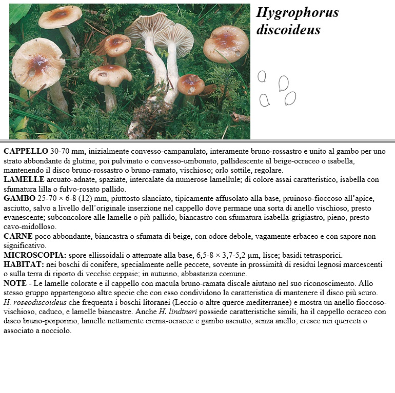 CAPPELLO 30-70 mm, inizialmente convesso-campanulato, interamente bruno-rossastro e unito al gambo per uno strato abbondante di glutine, poi pulvinato o convesso-umbonato, pallidescente al beige-ocraceo o isabella, mantenendo il disco bruno-rossastro o bruno-ramato, vischioso, orlo sottile, regolare. LAMELLE arcuato-adnate, spaziate, intercalate da numerose lamellule,di colore assai caratteristico, isabella con sfumatura lilla o fulvo-rosato pallido. GAMBO 25-70 x 6-8 (12) mm, piuttosto slanciato, tipicamente affusolato alla base, pruinoso-fioccoso all'apice, asciutto, salvo a livello dell'originale inserzione nel cappello dove permane una sorta di anello cischioso, presto evanescente, subconcolore alle lamelle o più pallido, biancastro con sfumatura isabella-grigiastro, pieno, presto caco-midolloso. CARNE poco abbondante, biancastra o sfumata di beige, con odore debole, vagamente erbaceo e con sapore non significatico. MICROSCOPIA spore ellissoidali o attenuate alla base, 6,5-8 x 3,7-5,2 µm, lisce, basidi tetrasporici. HABITAT nei boschi di conifere, specialmente nelle peccete, sovente in prossimità di residui legnosi marcescenti o sulla terra di riporto di vecchie ceppaie, in autunno, abbastanza comune. NOTE - Le lamelle colorate e il cappello con macula bruno-ramata discale aiutano nel suo riconoscimento. Allo stesso gruppo appartengono altre specie che con esso condividono la caratteristica di mantenere il disco più scuro. H. roseodiscoideus che frequenta i boschi litoranei (Leccio o altre querce mediterranee) e mostra un anello fioccoso-cischioso, caduco, e lamelle biancastre. Anche H. lindmeri possiede caratteristiche simili, ha il cappello ocraceo con disco bruno-porporino, lamelle nettamente crema-ocracee e gambo asciutto, senza anello, cresce nei querceti o associato a nocciolo.