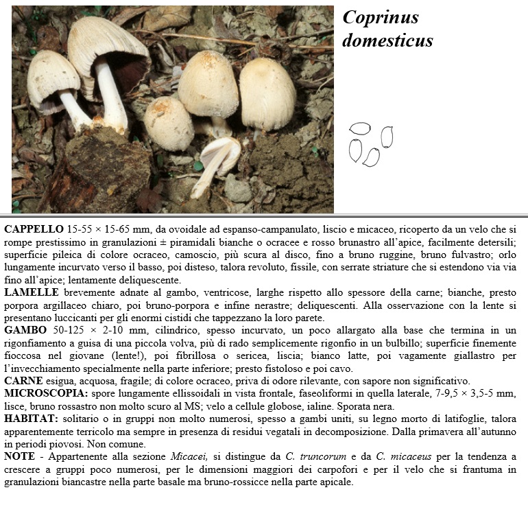 CAPPELLO 15-55 x 15-65 mm, da ovoidale ad espanso-campanulato, liscio e micaceo, ricoperto da un velo che si rompe prestissimo in granulazione più o meno piramidali bianche o ocracee e rosso brunastro all'apice, facilmente detersili, superficie pileica di colore ocraceo, camoscio, più scura al disco, fino a bruno ruggine, bruno fulvastro, orlo lungamente incurvato verso il basso, poi disteso, talora revoluto, fissile, con serrate striature che si estendono via via fino all'apice, lentamente deliquescente. LAMELLE brevemente adnate al gambo, ventricose, larghe rispetto allo spessore della carne, bianche, presto porpora argillaceo chiaro, poi bruno-porpora e infine nerastre, deliquescenti. Alla osservazione con la lente si presentano luccicanti per gli enormi cistidi che tappezzano la loro parete. GAMBO 50-125 x 2-10 mm, cilindrico, spesso incurvato, un poco allargato alla base che termina in un rigonfiamento a guisa di una piccola volva, più di rado semplicemente rigonfio in un bulbillo, superficie finemente fioccosa nel giovane (lente), poi fibrillosa o sericea, liscia, bianco latte, poi vagamente giallastro per l'invecchiamento specialmente nella parte inferiore, presto fistoloso e poi cavo. CARNE esigua, acquosa, fragile, di colore ocraceo, priva di odore rilevante, con sapore non significativo. MICROSCOPIA spore lungamente ellissoidali in vista frontale, faseoliformi in quella laterale, 7-9,5 x 3,5-5 mm, lisce, bruno rossastro non molto scuro al MS, velo a cellule globose, ialine. Sporata nera. HABITAT solitario o in gruppi non molto numerosi, spesso a gambi uniti, su legno morto di latifoglie, talora apparentemente terricolo ma sempre in presenza di residui vegatali in decomposizione. Dalla primavera all'autunno in periodi piovosi. Non comune. NOTE - Appartenente alla sezione Micacei, si distingue da C. truncorum e da C. micaceus per la tendenza a crescere a gruppi poco numerosi, per le dimensioni maggiori dei carpofori e per il velo che si frantuma in granulazioni biancastre nella parte basale ma bruno-rossicce nella parte apicale