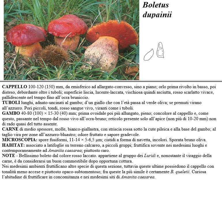 CAPPELLO 100-120 (150) mm, da emisferico ad allargato-convesso, sino a piano, orlo prima rivolto in basso, poi disteso, debordante oltre i tuboli, superficie lìscìa, lucente-laccata, vischiosa quindi asciutta, rosso scarlatto vivace, pallidescente nel tempo fino all'ocra bruniccio. TUBOLI lunghi, adnato-uncinati al gambo, d'un giallo che con 1'età passa al verde oliva, se premuti virano all'azzurro. Pori piccoli, tondi, rosso sangue vivo, viranti come i tuboli. GAMBO 40-80 (100) x 15-30 (40) mm, prima ovoidale poi più allungato, pieno, concolore al cappello e, come questo, passante nel tempo dal rosso vivo all'ocra-bruno, reticolo presente solo all'apice (non più di 10-20 mm) non di rado quasi del tutto assente. CARNE di medio spessore, molle, bianco-giallastra, con striscia rossa sotto la cute pileica e alla base del gambo, al taglio vira per zone all'azzurro-bluastro, odore fruttato e sapore gradevole. MICROSCOPIA spore fusiformi, 11-14 x5-6,5 µm, cistidi a forma di navetta, incolori. Sporata bruno oliva. HABITAT associato a latifoglie su terreno calcareo, a piccoli gruppi, fruttifica sovente nei medesimi luoghi e contemporaneamente ad Amanita caesarea, piuttosto raro. NOTE - Bellissimo boleto dal colore rosso laccato, appartiene al gruppo dei Luridi e, nonostante il viraggio della carne, è da considerarsi un buon commestibile dopo opportuna cottura. Nei medesimi ambienti fruttificano altre specie di questa sezione, tuttavia queste ultime possiedono il cappello con tonalità meno accese e piuttosto opaco - subtomentoso fra queste la più simile è certamente B. queletii. Curiosa l'abitudine di fruttificare in concomitanza e nei medesimi siti di Amanita caesarea