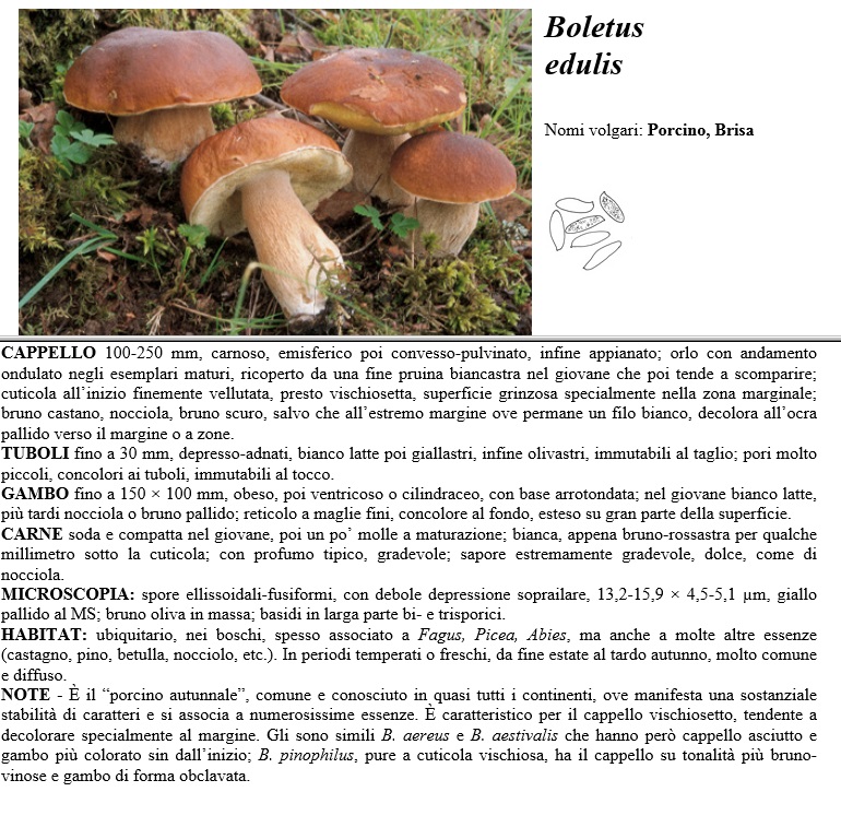 CAPPELLO 100-250 mm, carnoso, emisferico poi convesso-pulvinato, infine appianato, orlo con andamento ondulato negli esemplari maturi, ricoperto da una fine pruina biancastra nel giovane che poi tende a scomparire, cuticola all'inizio finemente vellutata, presto viscluosetta, superficie grinzosa specialmente nella zona marginale, bruno castano, nocciola, bruno scuro, salvo che all'estremo margine ove permane un filo bianco, decolora all'ocra pallido verso il margine o a zone. TUBOLI fino a 30 mm, depresso-adnati, bianco latte poi giallastri, infine olivastri, immutabili al taglio, pori molto piccoli, concolori ai tuboli, immutabili al tocco. GAMBO fino a 150 x 100 mm, obeso, poi ventricoso o cilindraceo, con base arrotondata, nel giovane bianco latte, più tardi nocciola o bruno pallido, reticolo a maglie fini, concolore al fondo, esteso su gran parte della superficie. CARNE soda e compatta nel giovane, poi un po' molle a maturazione, bianca, appena bruno-rossastra per qualche millimetro sotto la cuticola, con profumo tipico, gradevole, sapore estremamente gradevole, dolce, come di nocciola. MICROSCOPIA spore ellissoidali-fusiformi, con debole depressione soprailare, 13,2-15,9 x 4,5-5,1 µm, giallo pallido al MS, bruno oliva in massa, basidi in larga parte bisporici, e trisporici. HABITAT ubiquitario, nei boschi, spesso associato a Fagus, Picea, Abies, ma anche a molte altre essenze (castagno, pino, betulla, nocciolo, etc.). In periodi temperati o freschi, da fine estate al tardo autunno, molto comune e diffuso. NOTE - E il "Porcino Autunnale", comune e conosciuto in quasi tutti i continenti, ove manifesta una sostanziale stabilità di caratteri e si associa a numerosissime essenze. E caratteristico per il cappello cischiosetto, tendente a decolorare specialmente al margine. Gli sono simili B. aereus e B. aestivalis che hanno però cappello asciutto e gambo più colorato sin dall'inizio, B. pinophilus, pure a cuticola cischiosa, ha il cappello su tonalità più bruno-vinose e gambo di forma obclavata.