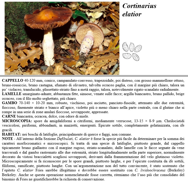 CAPPELLO 40-120 mm, conico, campanulato-convesso, trapezoidale, poi disteso, con grosso mammellone ottuso, bruno-rossiccio, bruno castagna, sfumato di olivastro, talvolta ocraceo paglia, con il margine più chiaro, talora un po' violaceo, translucido, plissettato-striato fino a metà raggio, talora, notevolmente rigato-scanalato radialmente. LAMELLE smarginato-adnate, abbastanza fitte, sinuose. venate sulle facce, argilla biancastro, bruno pallido, beige ocraceo, con il filo molto seghettato, più chiaro. GAMBO 70-140 x 10-20 mm, robusto, vischioso, poi asciutto, panciuto-fusoide, attenuato alle due esuemità, fioccoso, finemente striato e bianco all'apice, violetto più o meno chiaro nella parte centrale, con il glutine che si rompe in una serie di zone anulari fioccose, sovrapposte, appressate. CARNE biancastra, ocracea dolce, con odore di miele. MICROSCOPIA spore da amigdaliformi a citriformi, mediamente verrucose, 13-15 x 8-9 µm. Cheilocistidi vescicolosi, piriformi, abbondanti, in mazzetti, emergenti. Epicute sottile, completamente gelatinizzata, con ife gracili. HABITAT nei boschi di latifoglie, principalmente di querce e fassi, non comune. NOTE - All'interno della Sezione Defibulati, C. elatior è forse la specie più facile da determinare per la somma dei caratteri morfocromatici e microscopici. Si tratta di una specie di latifoglie, piuttosto grande, dal cappello tipicamente bruno giallastro con il margine rugoso, striato-scanalato, dalle lamelle con le facce segnate da vene trasversali e dal gambo rastremato alle due estremità, striato longitudinalmente nella parte superiore, normalmente decorato da vistosi braccialetti scagliosi sovrapposti, derivanti dalla frammentazione del velo glutinoso violetto. Microscopicamente si fa riconoscere per le spore grandi, piuttosto larghe, e per l'epicute costituita da ife sottili, filiformi, ramificate, piuttosto lunghe. Con un'argomentazione non del tutto convincente, è stato sostenuto che l'epiteto C. elatior Fries sarebbe illegittimo e dovrebbe essere sostituito con C. lividoochraceus (Berkeley) Berkeley. Anche se questa operazione nomenclaturale fosse corretta, riteniamo che l'uso più che consolidato del binomio di Fries ne giustificherebbe la richiesta di conservazione.