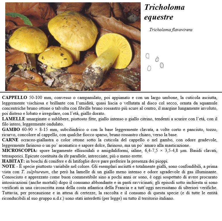 CAPPELLO 50-100 mm, convesso o campanulato, poi appianato e con un largo umbone, la cuticola asciutta. leggermente vischiosa e brillante con l'umidità quasi liscia o vellutata al disco col secco, ornata da squamule concentriche bruno ottone o talvolta con fibrille bruno rossastro più scure al centro, il margine lungamente incoluto, poi disteso e lobato e irregolare, con l'età, giallo dorato. LAMELLE smarginate o sublibere, piuttosto fitte; giallo intenso o giallo citrino, tendenti a scurire con l'età, con il filo intero, leggermente ondulato. GAMBO 60-90 x 8-15 mm, subcilindrico o con la base leggermente clavata, a volte corto e panciuto, tozzo, ricurvo, concolore al cappello, con qualche fiocco sparso, bruno rossastro chiaro, verso la base. CARNE ocraceo-giallastra o color ottone sotto la cuticola del cappello o nel gambo; con odore gradecole, leggermente farinoso o un po' aromatico e sapore dolce, farinoso, ma un po' amaro alla masticazione. MICROSCOPIA spore largamente ellissoidali o amigdaliformi, ialine, 6,4-7,5 x 3,5-4,8 µm. Basidi clavati, tetrasporici. Epicute costituita da ife parallele, intrecciate, più o meno erette. HABITAT in boschi di conifere e di latifoglie dove pare preferire la presenza dei pioppi. NOTE - E specie piuttosto variabile nel colore. Gli esemplari asciutti e totalmente gialli, sono confondibili, a prima vista con T. sulphureum; che però ha lamelle di un giallo meno intenso e odore sgradevole di gas illuminante. Conosciuto e apprezzato come buon commestibile sino a pochi anni or sono, è oggi sospettato di avere procurato intossicazioni (anche mortali) dopo il consumo abbondante e in pasti ravvicinati; gli episodi sotto inchiesta si sono verificati in una circoscritta zona della costa atlantica della Francia e a tutt'oggi necessitano di ulteriori verifiche. Tuttavia, per precauzione e in attesa di certezze, la raccolta e il consumo di questa specie (e di tutte le entità riconducibili al suo gruppo n.d.r.) sono stati interdetti (per legge) su tutto il territorio italiano.