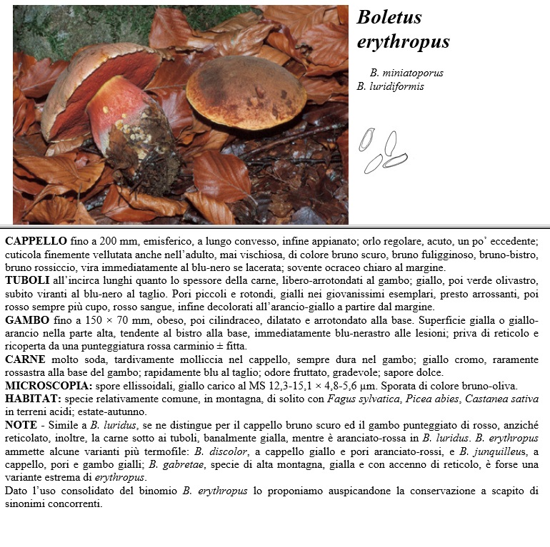 CAPPELLO fino a 200 mm, emisferico, a lungo convesso, infine appianato, orlo regolare, acuto, un po' eccedente, cuticola finemente vellutata anche nell'adulto, mai cischiosa di colore bruno scuro, bruno fuligginoso, bruno-bistro, bruno rossiccio, vira immediatamente al blu-nero se lacerata, sovente ocraceo chiaro al margine. TUBOLI all'incirca lunghi quanto lo spessore della carne, libero-arrotondati al gambo giallo, poi verde olivastro, subito viranti al blu-nero al taglio. Pori piccoli e rotondi, gialli nei giovanissimi esemplari, presto arrossanti, poi rosso sempre più cupo, rosso sangue, infine decolorati all'arancio-giallo a partire dal margine. GAMBO fino a 150 x 70 mm, obeso, poi cilindraceo, dilatato e arrotondato alla base. Superficie gialla o giallo-arancio nella parte alta tendente al bistro alla base, immediatamente blu-nerastro alle lesioni, priva di reticolo e ricoperta da una punteggiatura rossa carminio più o meno fitta. CARNE molto soda, tardivamente molliccia nel cappello, sempre dura nel gambo, giallo cromo, raramente rossastra alla base del gambo, rapidamente blu al taglio, odore fruttato, gradevole, sapore dolce. MICROSCOPIA spore ellissoidali, giallo carico al MS 12,3-15,1 x 4,8-5,6 µm. Sporata di colore bruno-oliva. HABITAT specie relativamente comune, in montagna, di solito con Fagus sylvatica, Picea abies, Castanea sativa in terreni acidi, estate-autunno. NOTE - Simile a B. hiridus se ne distingue per il cappello bruno scuro ed il gambo punteggiato di rosso, anziché reticolato, inoltre, la carne sotto ai tuboli, banalmente gialla, mentre è aranciato-rossa in B. luridus, B. erythropus ammette alcune varianti più termofile, B. discolor, a cappello giallo e pori aranciato-rossi, e B. junquilleus, a cappello, pori e gambo gialli, B. gabretae, specie di alta montagna, gialla e con accenno di reticolo, è forse una variante estrema di erythropus. Dato l'uso consolidato del binomio B. erythropus lo proponiamo auspicandone la conservazione a scapito di sinonimi concorrenti