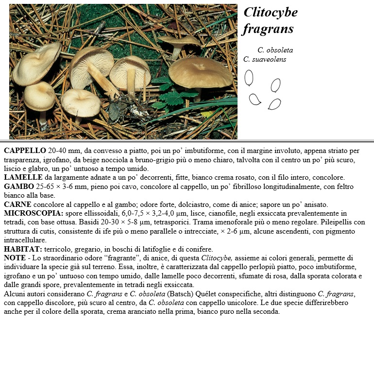 CAPPELLO 20-40 mm, da convesso a piatto, poi un po' imbutiforme, con il margine involuto, appena striato per trasparenza, igrofano, da beige nocciola a bruno-grigio più o meno chiaro, talvolta con il centro un po' più scuro, liscio e glabro, un po' untuoso a tempo umido. LAMELLE da largamente adnate a un po' decorrenti, fitte, bianco crema rosato, con il filo intero, concolore. GAMBO 25-65 x 3-6 mm, pieno poi caco, concolore al cappello, un po' fibrilloso longitudinalmente, con feltro bianco alla base. CARNE concolore al cappello e al gambo, odore forte, dolciastro, come di anice, sapore un po' anisato. MICROSCOPIA spore ellissoidali, 6,0-7,5 x 3,2-4,0 µm, lisce, cianofile, negli exsiccata prevalentemente in tetradi, con base ottusa. Basidi 20-30 x 5-8 µm, tetrasporici. Trama imenoforale più o meno regolare. Pileipellis con struttura di cutis, consistente di ife più o meno parallele o intrecciate, x 2-6 µm, alcune ascendenti, con pigmento inuacellulare. HABITAT terricolo, gregario, in boschi di latifoglie e di conifere. NOTE - Lo straordinario odore "fragrante", di anice, di questa Clitoclibe, assieme ai colori generali, permette di individuare la specie già sul terreno. Essa, inoltre, è caratterizzata dal cappello perlopiù piatto, poco imbutiforme, igrofano e un po' untuoso con tempo umido, dalle lamelle poco decorrenti, sfumate di rosa, dalla sporata colorata e dalle grandi spore, prevalentemente in tetradi negli exsiccata. Alcuni autori considerano C. fragrans e C. obsoleta (Batsch) Quélet conspecifiche, altri distinguono C. fragrans, con cappello discolore, più scuro al cenuo, da C. obsoleta con cappello unicolore. Le due specie differirebbero anche per il colore della sporata, crema aranciato nella prima, bianco puro nella seconda.