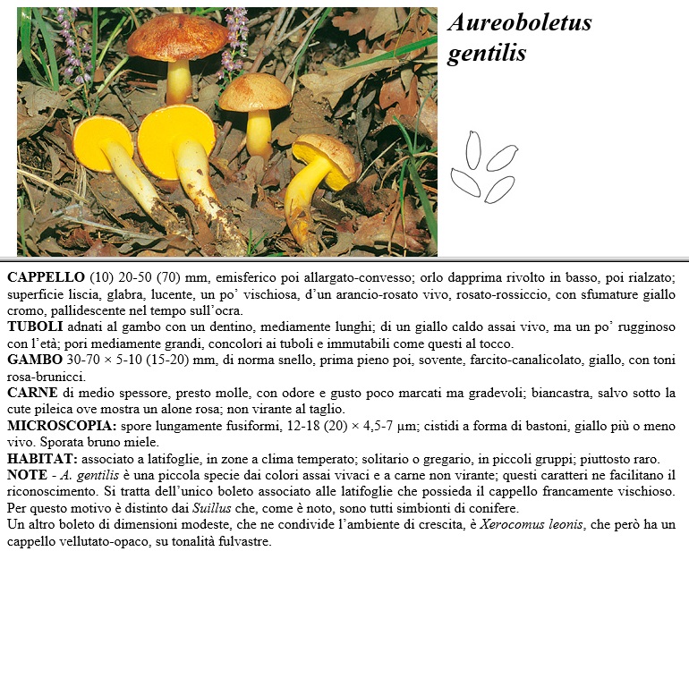 CAPPELLO (10) 20-50 (70) mm, emisferico poi allargato-convesso, orlo dapprima rivolto in basso, poi rialzato, superficie liscia, glabra, lucente, un po' vischiosa, d'un arancio-rosato vico, rosato-rossiccio, con sfumature giallo cromo, pallidescente nel tempo sull'ocra. TUBOLI adnati al gambo con un dentino, mediamente lunghi, di un giallo caldo assai vivo, ma un po' rugginoso con l'età, pori mediamente grandi, concolori ai tuboli e immutabili come questi al tocco. GAMBO 30-70 x 5-10 (15-20) mm, di norma snello, prima pieno poi, sovente, farcito-canalicolato, giallo, con toni rosa-brunicci. CARNE di medio spessore, presto molle, con odore e gusto poco marcati ma gradevoli, biancastra, salvo sotto la cute pileica ove mostra un alone rosa, non tirante al taglio. MICROSCOPIA spore lungamente fusiformi, 12-18 (20) x 4,5-7 µm, cistidi a forma di bastoni, giallo più o meno vivo. Sporata bruno miele. HABITAT associato a latifoglie, in zone a clima temperato, solitario o gregario, in piccoli gruppi, piuttosto raro. NOTE - A. gentilis è una piccola specie dai colori assai vivaci e a carne non virante, questi caratteri ne facilitano il riconoscimento. Si tratta dell'unico boleto associato alle latifoglie che possieda il cappello francamente vischioso. Per questo motivo è distinto dai Suillus che, come è noto, sono tutti simbionti di conifere. Un altro boleto di dimensioni modeste, che ne condivide l'ambiente di crescita, è Xerocomus leonis, che però ha un cappello vellutato-opaco, su tonalità fulvastre.
