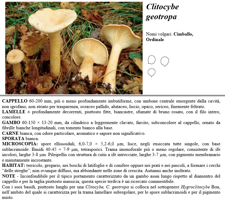 CAPPELLO 60-200 mm, più o meno profondamente imbutiforme, con umbone centrale emergente dalla cacità, non igrofano, non striato per uasparenza ocraceo pallido, alutaceo, liscio, opaco, sericeo, finemente feltrato. LAMELLE più o meno profondamente decorrenti, piuttosto fitte, biancastre, sfumate di bruno rosato, con il filo intero, concolore. GAMBO 60-150 x 13-20 mm, da cilindrico a leggermente clavato, farcito, subconcolore al cappello, ornato da fibrille bianche loneitudinali, con tomento bianco alla base. CARNE bianca, con odore particolare, aromatico e sapore non significativo. SPORATA bianca. MICROSCOPIA spore ellissoidali, 6,0-7,0 x 5,2-6,0 µm, lisce, negli exsiccata tutte singole, con base sublacrimoide. Basidi 40-45 x 7-9 µm, tetrasporici. Trama imenoforale più o meno regolare, consistente di ife incolori, larghe 3-8 µm. Pileipellis con struttura di cutis a ife intrecciate, larghe 3-7 µm, con pigmento membranario e minutamente incrostante. HABITAT terricolo, gregario, nei boschi di latifoglie e di conifere oppure nei prati e nei pascoli, a formare i cerchi "delle streghe", non ovunque diffuso, ma abbondante nelle zone di crescita. Autunno anche inoltrato. NOTE - Inconfondibile per il tipico portamento caratterizzato da un gambo assai lungo rispetto al diamentro del cappello e per la taglia piuttosto massicia, questa specie terdiva è un ricercato commestibile. Con i suoi basidi, piuttosto lunghi per una Clitocibe, C. geotropa si colloca nel sottogenere Hygroclitocybe Bon, nell'ambito del quale si caratterizza per la traina lamellare subregolare, per le spore sublacrimoidi e per il pigmento misto.