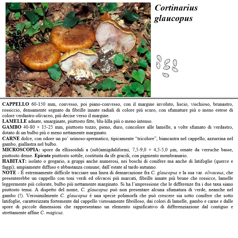 CAPPELLO 60-150 mm, convesso, poi piano-convesso, con il margine involuto, liscio, vischioso, brunasuo, rossiccio, densamente segnato da fibrille innate radiali di colore più scuro, con sfumature più o meno estese di colore cerdastro-olivaceo, più decise verso il margine. LAMELLE adnate, smarginate, piuttosto fitte, blu-lilla più o meno intenso. GAMBO 40-80 x 15-25 mm, piuttosto tozzo, pieno, duro, concolore alle lamelle, a volte sfumato di verdastro, dotato di un bulbo più o meno nettamente marginato. CARNE dolce, con odore un po' urinoso-spermatico, tipicamente "tricolore", biancastra nel cappello, azzurrina nel gambo, giallastra nel bulbo. MICROSCOPIA spore da ellissoidali a (sub)amigdaliformi, 7,5-9,0 x 4,5-5,0 µm, ornate da verruche basse, piuttosto dense. Epicute piuttosto sottile, costituita da ife gracili, con pigmento membranario. HABITAT isolato o gregario, a gruppi anche numerosi, nei boschi di conifere ma anche di latifoglie (querce e faggi), ampiamente diffuso e abbastanza comune, dall'estate al tardo autunno. NOTE - E estremamente difficile tracciare una linea di demarcazione fra C. glaucopus e la sua var. olivaceus, che presenterebbe un cappello con toni verdi ed olivacei più marcati, fibrille innate più brune che rossicce, lamelle leggermente più colorate, bulbo più nettamente marginato. Si ha l'impressione che le differenze fra i due taxa siano piuttosto tenui. A dispetto del nome, C. glaucopus può non presentare alcuna sfumatura di verde, neanche nel gambo. Verosimilmente C. glaucopus è una specie polimorfa che può crescere sia sotto conifere che sotto latifoglie, caratterizzata fortemente dal cappello vistosamente fibrilloso, dai colori di lamelle, gambo e carne e dalle spore di piccole dimensioni che rappresentano un elemento significativo di differenziazione dal contiguo e strettamente affine C. magicus.