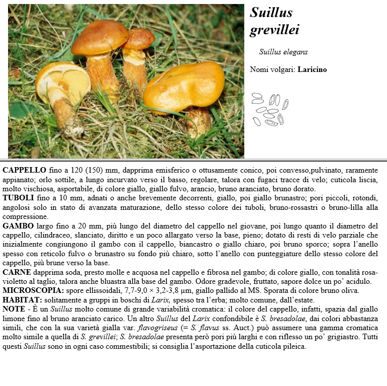 CAPPELLO fino a 120 (150) mm, dapprima emisferico o ottusamente conico, poi convesso, pulvinato, raramente appianato, orlo sottile, a lungo incurvato verso il basso, regolare, talora con fugaci tracce di velo, cuticola liscia, molto vischiosa, asportabile, di colore giallo, giallo fulvo, arancio, bruno aranciato, bruno dorato. TUBOLI fino a 10 mm, adnati o anche brevemente decorrenti, giallo, poi giallo brunastro, pori piccoli, rotondi, angolosi solo in stato di avanzata maturazione, dello stesso colore dei tuboli, bruno-rossastri o bruno-lilla alla compressione. GAMBO largo fino a 20 mm, più lungo del diametro del cappello nel giovane, poi lungo quanto il diametro del cappello, cilindraceo, slanciato, diritto e un poco allargato verso la base, pieno, dotato di resti di velo parziale che inizialmente congiungono il gambo con il cappello, biancastro o giallo chiaro, poi bruno sporco, sopra l'anello spesso con reticolo fulvo o brunastro su fondo più chiaro, sotto l'anello con punteggiature dello stesso colore del cappello, più brune verso la base. CARNE dapprima soda, presto molle e acquosa nel cappello e fibrosa nel gambo, di colore giallo, con tonalità rosa-violetto al taglio, talora anche bluastra alla base del gambo. Odore sgradevole, fruttato, sapore dolce un po' acidulo. MICROSCOPIA spore ellissoidali, 7,7-9,0 x 3,2-3,8 µm, giallo pallido al MS. Sporata di colore bruno oliva. HABITAT solitamente a gruppi in boschi di Laris, spesso tra l'erba, molto comune, dall'estate. NOTE - È un Suillus molto comune di grande variabilità cromatica, il colore del cappello, infatti, spazia dal giallo limone fino al bruno aranciato carico. Un altro Suillus del Larix confondibile è S. bresadolae, dai colori abbastanza simili, che con la sua varietà gialla var. flavogriseus (S. flavus ss. Auct.) può assumere una gamma cromatica molto simile a quella di S. grevillei; S. bresadolae presenta però pori più larghi e con riflesso un po' grigiastro. Tutti questi Suillus sono in ogni caso commestibili, si consiglia l'asportazione della cuticola pileica.
