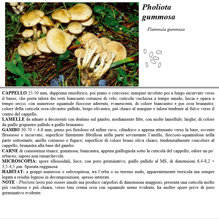 CAPPELLO 25-50 mm, dapprima emisferico, poi piano o convesso, margine involuto poi a lungo incurvato verso il basso, che porta talora dei resti biancastri cotonosi di velo, cuticola vischiosa a tempo umido, liscia e opaca a tempo secco, con numerose squamule fioccose aderenti, evanescenti, di colore biancastro e poi ocra brunastro, colore della cuticola ocra-olivastro pallido, beige-olivastro, più chiaro al margine e talora tendente al fulvo verso il centro del cappello. LAMELLE da adnate a decorrenti con dentino sul gambo, mediamente fitte, con molte lamellule, larghe, di colore da giallo grigiastro pallido a giallo brunastro. GAMBO 30-70 x 4-8 mm, pieno poi fistoloso ed infine cavo, cilindrico o appena attenuato verso la base, sovente flessuoso o incurvato, superficie finemente fibrillosa nella parte sovrastante l'anello, fioccoso-squamulosa nella parte sottostante, anello cotonoso e fugace, superficie di colore bruno oliva chiaro, tendenzialmente concolore al cappello, brunastra alla base del gambo. CARNE di consistenza tenace, gommosa, biancastra, appena giallognola sotto la cuticola del cappello, odore un po' erbaceo, sapore non rimarchevole. MICROSCOPIA spore ellissoidali, lisce, con poro germinativo, giallo pallido al MS, di dimensioni 6,4-8,2 x 3,5-4,5 µm. Sporata rugginosa. HABITAT a gruppi numerosi o subcespitosa, tra l'erba o su terreno nudo, apparentemente terricola ma sempre legata a residui legnosi in decomposizione, spesso interrati. NOTE - Pholiota lenta può essere simile ma produce carpofori di dimensioni maggiori, presenta una cuticola molto più vischiosa e più chiara, verso toni crema ocra con squamule meno evidenti: ha inoltre spore prive di poro germinativo evidente.