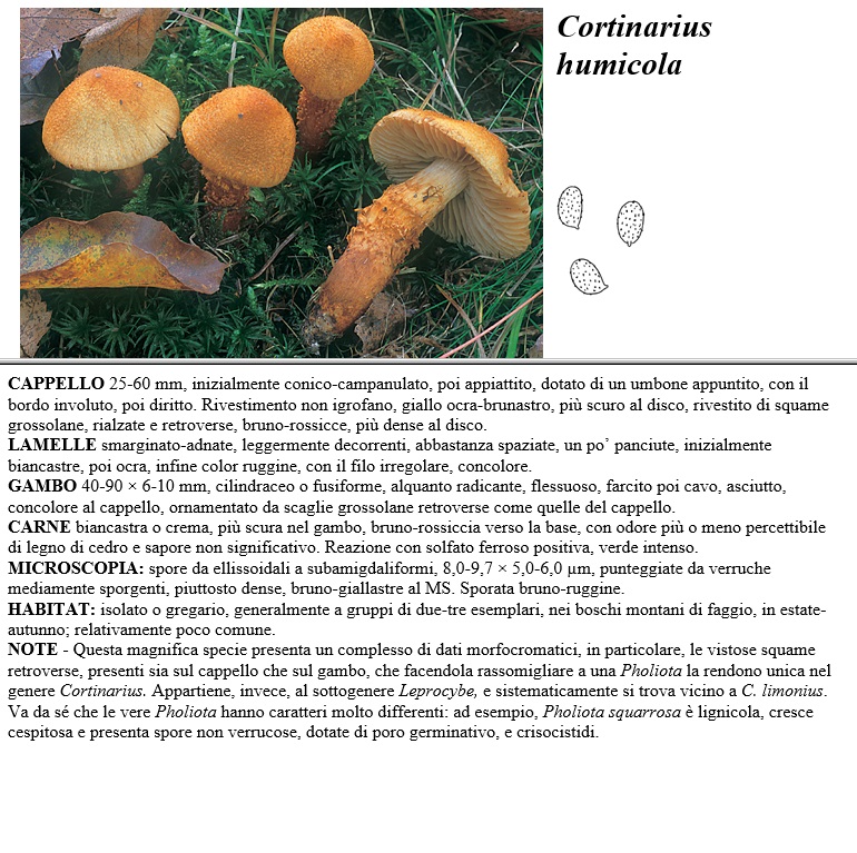CAPPELLO 25-60 mm, inizialmente comco-campanulato, poi appiattito, dotato di un umbone appuntìto, con il bordo involuto, poi diritto. Rivestimento non igrofano, giallo ocra-brunastro, più scuro al disco, rivestito di squame grossolane, rialzate e retroverse, bruno-rossicce, più dense al disco. LAMELLE smarginato-adnate, leggermente decorrenti, abbastanza spaziate, un po' panciute, inizialmente biancastre, poi ocra, infine color ruggine, con il filo irregolare, concolore. GAMBO 40-90 x 6-10 mm, cilindraceo o fusiforme, alquanto radicante, flessuoso, farcito poi cavo, asciutto, concolore al cappello, ornamentato da scaglie grossolane retroverse come quelle del cappello. CARNE biancastra o crema, più scura nel gambo, bruno-rossiccia verso la base, con odore più o meno percettibile di legno di cedro e sapore non significativo. Reazione con solfato ferroso positiva, verde intenso. MICROSCOPIA spore da ellissoidali a subamigdaliformi, 8,0-9,7 x 5,0-6,0 µm, punteggiate da verruche mediamente sporgenti, piuttosto dense, bruno-giallastre al MS. Sporata bruno-ruggine. HABITAT isolato o gregario, generalmente a gruppi di due-tre esemplari, nei boschi montani di faggio, in estate-autunno, poco comune. NOTE - Questa magnifica specie presenta un complesso di dati morfocromatici, in particolare, le vistose squame retrocerse, presenti sia sul cappello che sul gambo, che facendola rassomigliare a una Pholiota la rendono unica nel genere Cortinarius. Appartiene, invece, al sottogenere Leprocybe, e sistematicamente si trova vicino a C limonius. Va da sé che le vere Pholiota hanno caratteri molto differenti, ad esempio, Pholiota squarrosa è lignicola, cresce cespitosa e presenta spore non verrucose, dotate di poro germinatico, e crisocistidi.