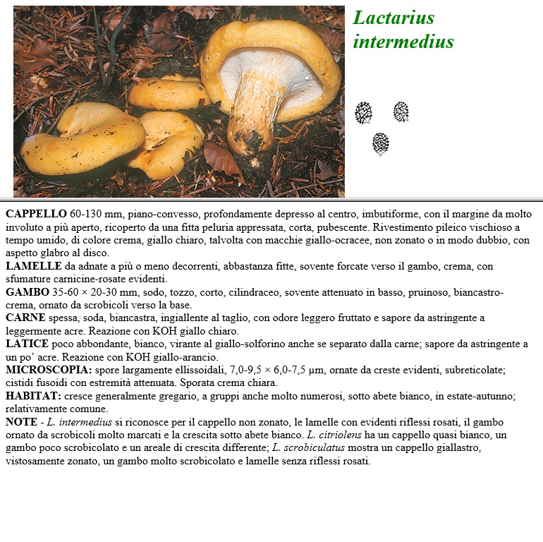 CAPPELLO 60-130 mm, piano-convesso, profondamente depresso al centro, imbutiforme, con il margine da molto involuto a più aperto, ricoperto da una fitta peluria appressata, corta pubescente. Rivestimento pileico vischioso a tempo umido, di colore crema, giallo chiaro, talvolta con macchie giallo-ocracee, non zonato o in modo dubbio, con aspetto glabro al disco. LAMELLE da adnate a più o meno decorrenti, abbastanza fitte, sovente forcate verso il gambo, crema, con sfumature carnicine-rosate evidenti. GAMBO 35-60 x 20-30 mm, sodo, tozzo, corto, cilindraceo, sovente attenuato in basso, pruinoso, biancastro-crema. ornato da scrobicoli verso la base. CARNE spessa, soda, biancastra, ingiallente al taglio, con odore leggero fruttato e sapore da astringente a leggermente acre. Reazione con KOH giallo chiaro. LATTICE poco abbondante, bianco, virante al giallo-solforino anche se separato dalla carne, sapore da astringente a un po' acre. Reazione con KOH giallo-arancio. MICROSCOPIA spore largamente ellissoidali, 7,0-9,5 x 6,0-7,5 µm, ornate da creste evidenti, subreticolate, cistidi fusoidi con estremità attenuata. Sporata crema chiara. HABITAT cresce oeneralmente gregario, a gruppi anche molto numerosi, sotto abete bianco, in estate-autunno, relativamente comune. NOTE - L. intermedius si riconosce per il cappello non zonato, le lamelle con evidenti riflessi rosati, il gambo ornato da scrobicoli molto marcati e la crescita sotto abete bianco. L. citriolens ha un cappello quasi bianco, un gambo poco scrobicolato e un areale di crescita differente, L. scrobiculatus mostra un cappello giallastro, vistosamente zonato, un gambo molto scrobicolato e lamelle senza riflessi rosati.