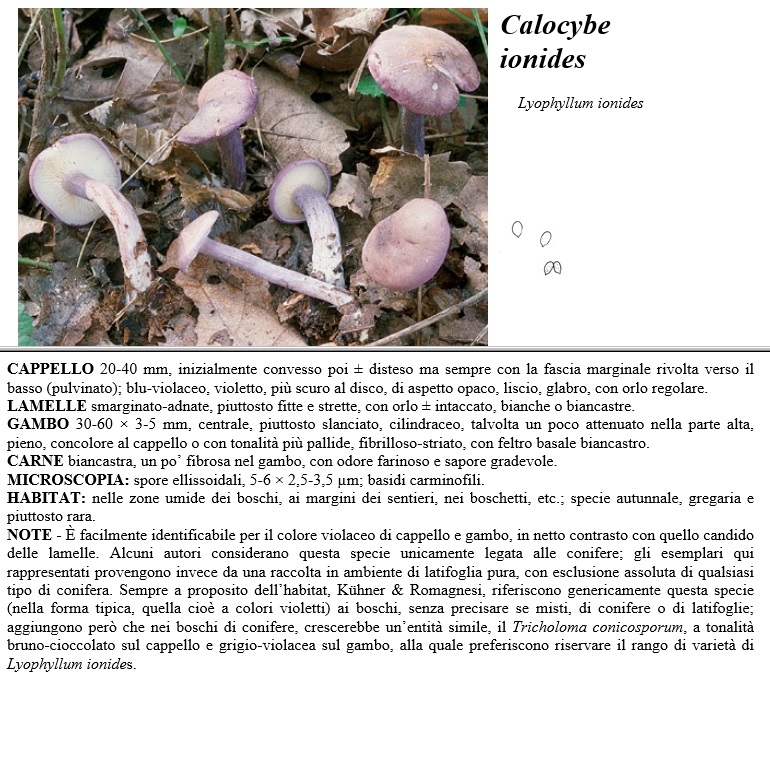 CAPPELLO 20-40 mm, inizialmente convesso poi t disteso ma sempre con la fascia marginale rivolta verso il basso (pulvinato), blu-ciolaceo, cioletto, più scuro al disco, di aspetto opaco, liscio, glabro, con orlo regolare. LAMELLE smarginato-adnate, piuttosto fitte e strette, con orlo più o meno intaccato, bianche o biancastre. GAMBO 30-60 x 3-5 mm, centrale, piuttosto slanciato, cilindraceo, talvolta un poco attenuato nella parte alta, pieno, concolore al cappello o con tonalità più pallide, fibrilloso-striato, con feltro basale biancastro. CARNE biancastra, un po' fibrosa nel gambo, con odore farinoso e sapore gradevole. MICROSCOPIA spore ellissoidali, 5-6 x 2,5-3,5 µm, basidi carminofili. HABITAT nelle zone umide dei boschi, ai margini dei sentieri, nei boschetti, etc., specie autunnale, gregaria e piuttosto rara. NOTE - È facilmente identificabile per il colore violaceo di cappello e gambo, in netto contrasto con quello candido delle lamelle. Alcuni autori considerano questa specie unicamente legata alle conifere, gli esemplari qui rappresentati provengono invece da una raccolta in ambiente di latifoglia pura, con esclusione assoluta di qualsiasi tipo di conifera. Sempre a proposito dell'habitat, Kuhner & Romasnesi, riferiscono genericamente questa specie (nella forma tipica, quella cioè a colori violetti) ai boschi, senza precisare se misti, di conifere o di latifoglie, aggiungono però che nei boschi di conifere, crescerebbe un'entità simile, il Tricholoma conicosporum, a tonalità bruno-cioccolato sul cappello e grigio-violacea sul gambo, alla quale preferiscono riservare il rango di varietà di Lyoplttdhum ionides.