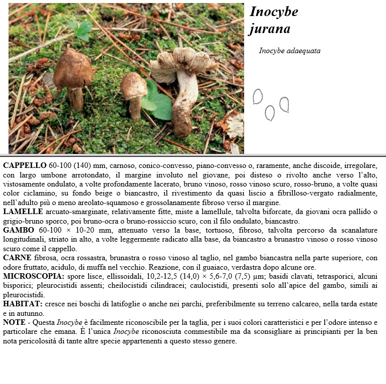 CAPPELLO 60-100 (140) mm, carnoso, conico-convesso, piano-convesso o, raramente, anche discoide, irregolare, con largo umbone arrotondato, il margine involuto nel giovane, poi disteso o rivolto anche verso l'alto, vistosamente ondulato, a volte profondamente lacerato, bruno vinoso, rosso vinoso scuro, rosso-bruno, a volte quasi color ciclamino, su fondo beige o biancastro, il rivestimento da quasi liscio a fibrilloso-vergato radialmente, nell'adulto più o meno areolato-squamoso e grossolanamente fibroso verso il margine. LAMELLE arcuato-smarginate, relativamente fitte, miste a lamellule, talvolta biforcate, da giovani ocra pallido o grigio-bruno sporco, poi bruno-ocra o bruno-rossiccio scuro, con il filo ondulato, biancastro. GAMBO 60-100 x 10-20 mm, attenuato verso la base, tortuoso, fibroso, talvolta percorso da scanalature longitudinali, striato in alto, a volte leggermente radicato alla base, da biancastro a brunastro vinoso o rosso vinoso scuro come il cappello. CARNE fibrosa, ocra rossastra, brunastra o rosso vinoso al taglio, nel gambo biancastra nella parte superiore, con odore fruttato, acidulo, di muffa nel vecchio. Reazione, con il guaiaco, verdastra dopo alcune ore. MICROSCOPIA spore lisce, ellissoidali, 10,2-12,5 (14,0) x 5,6-7,0 (7,5) µm, basidi clavati, tetrasporici, alcuni bisporici, pleurocistidi assenti, cheilocistidi alindracei, caulocistidi, presenti solo all'apice del gambo, simili ai pleurocistidi. HABITAT cresce nei boschi di latifoglie o anche nei parchi, preferibilmente su terreno calcareo, nella tarda estate e in autunno. NOTE - Questa Inocybe è facilmente riconoscibile per la taglia, per i suoi colori caratteristici e per l'odore intenso e particolare che emana. E l'unica Inocybe riconosciuta commestibile ma da sconsisliare ai principianti per la ben nota pericolosità di tante altre specie appartenenti a questo stesso genere.