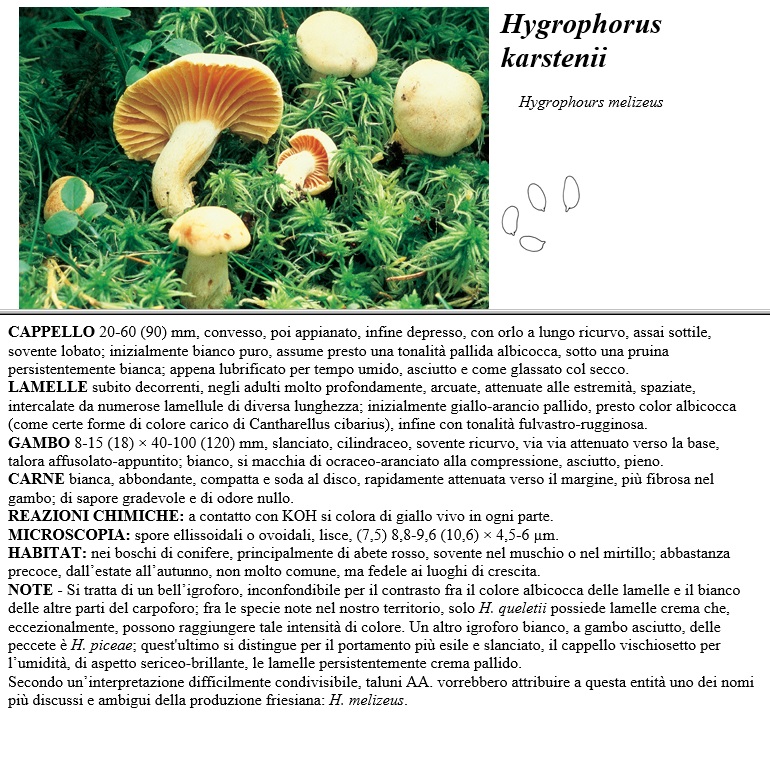 CAPPELLO 20-60 (90) mm, convesso, poi appianato, infine depresso, con orlo a lungo ricurvo, assai sottile, sovente lobato, inizialmente bianco puro, assume presto una tonalità pallida albicocca, sotto una pruina persistentemente bianca, appena lubrificato per tempo umido, asciutto e come glassato col secco. LAMELLE subito decorrenti negli adulti molto profondamente, arcuate, attenuate alle estremità spaziate, intercalate da numerose lamellule di diversa lunghezza, inizialmente giallo-arancio pallido, presto color albicocca (come certe forme di colore carico di Cantharellus cibarius), infine con tonalità fulvastro-rugginosa. GAMBO 8-15 (18) x 40-100 (120) mm, slanciato, cilindraceo, sovente ricurvo, via via attenuato verso la base, talora affusolato-appuntito, bianco, si macchia di ocraceo-aranciato alla compressione, asciutto, pieno. CARNE bianca, abbondante, compatta e soda al disco, rapidamente attenuata verso il margine, più fibrosa nel gambo, di sapore gradevole e di odore nullo. REAZIONI CHIMICHE a contatto con KOH si colora di giallo vivo in ogni parte. MICROSCOPIA spore ellissoidali o ovoidali, lisce, (7,5) 8,8-9,6 (10,6) x 4,5-6 µm. HABITAT nei boschi di conifere, principalmente di abete rosso, sovente nel muschio o nel mirtillo, abbastanza precoce, dall'estate all'autunno, non molto comune, ma fedele ai luoghi di crescita. NOTE - Si tratta di un bell'igroforo, inconfondibile per il contrasto fra il colore albicocca delle lamelle e il bianco delle altre parti del carpoforo, fra le specie note nel nostro territorio, solo H. queletii possiede lamelle crema che, eccezionalmente, possono raggiungere tale intensità di colore. Un altro igroforo bianco, a gambo asciutto, delle peccete è H. piceae, quest'ultimo si distingue per il portamento più esile e slanciato, il cappello vischiosetto per l'umidità, di aspetto sericeo-brillante, le lamelle persistentemente crema pallido. Secondo un'interpretazione difficilmente condivisibile, taluni AA. vorrebbero attribuire a questa entità uno dei nomi più discussi e ambigui della produzione friesiana: H.melizeus.