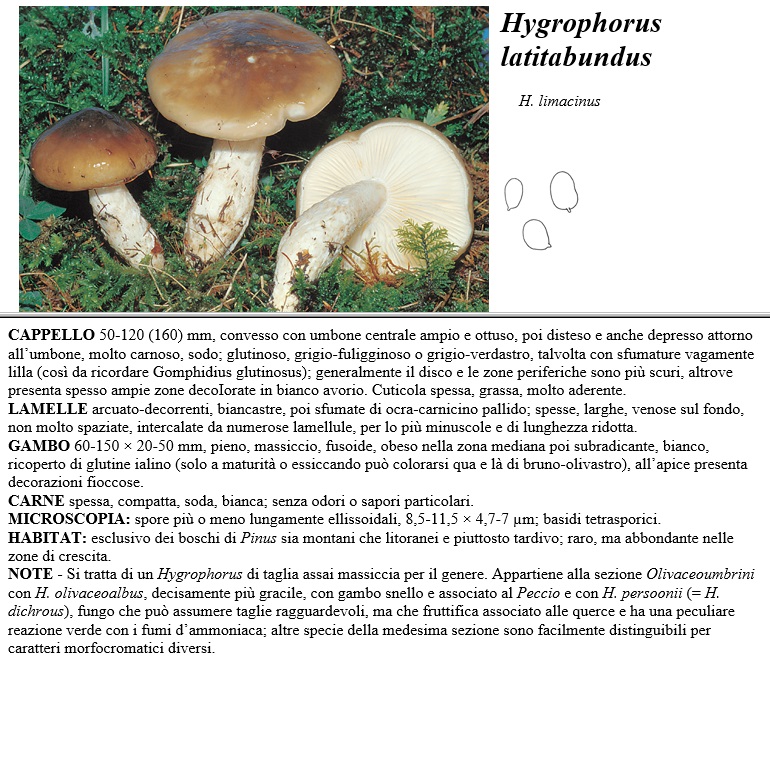 CAPPELLO 50-120 (160) mm, convesso con umbone centrale ampio e ottuso, poi disteso e anche depresso attorno all'umbone, molto carnoso, sodo, glutinoso, grigio-fuligginoso o grigio-verdastro, talvolta con sfumature vagamente lilla (così da ricordare Gomphidius glutinosus), generalmente il disco e le zone periferiche sono più scuri, altrove presenta spesso ampie zone decolorate in bianco avorio. Cuticola spessa, grassa, molto aderente. LAMELLE arcuato-decorrenti, biancastre, poi sfumate di ocra-carnicino pallido, spesse, larghe, venose sul fondo, non molto spaziate, intercalate da numerose lamellule, per lo più minuscole e di lunghezza ridotta. GAMBO 60-150 x 20-50 mm, pieno, massiccio, fusoide, obeso nella zona mediana poi subradicante, bianco, ricoperto di glutine ialino (solo a maturità o essiccando può colorarsi qua e là di bruno-olivastro), all'apice presenta decorazioni fioccose. CARNE spessa, compatta, soda, bianca, senza odori o sapori particolari. MICROSCOPIA spore più o meno lungamente ellissoidali, 8,5-11,5 x 4,7-7 µm, basidi tetrasporici. HABITAT esclusivo dei boschi di Pinus sia montani che litoranei e piuttosto tardivo, raro, ma abbondante nelle zone di crescita. NOTE - Si tratta di un Hygrophorus di taglia assai massiccia per il genere. Appartiene alla sezione Olivaceoumbrini con H. olivaceoalbus, decisamente più gracile, con gambo snello e associato al Peccio e con H. persoonii (H. dichrous), fungo che può assumere taglie ragguardevoli, ma che fruttifica associato alle querce e ha una peculiare reazione verde con i fumi d'ammoniaca, altre specie della medesima sezione sono facilmente distinguibili per caratteri morfocromatici diversi.