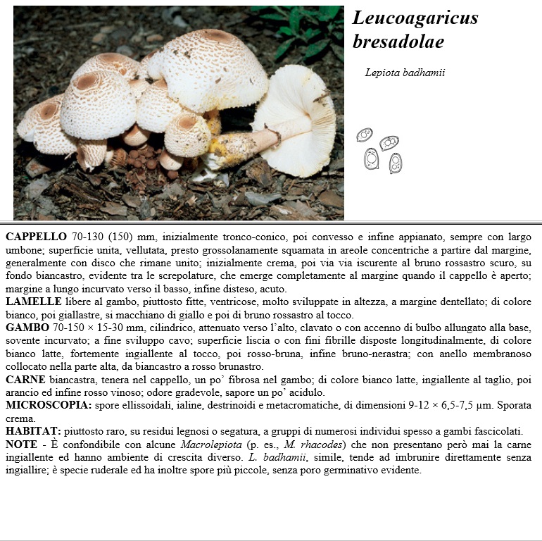 CAPPELLO 70-130 (150) mm, inizialmente tronco-conico, poi convesso e infine appianato, sempre con largo umbone, superficie unita vellutata, presto grossolanamente squamata in areole concentriche a partire dal margine, generalmente con disco che rimane unito, inizialmente crema, poi via via iscurente al bruno rossastro scuro, su fondo biancastro, evidente tra le screpolature, che emerge completamente al margine quando il cappello è aperto, margine a lungo incurvato verso il basso, infine disteso, acuto. LAMELLE libere al gambo, piuttosto fitte, ventricose, molto sviluppate in altezza, a margine dentellato, di colore bianco, poi giallastre, si macchiano di giallo e poi di bruno rossastro al tocco. GAMBO 70-150 x 15-30 mm, cilindrico, attenuato verso l'alto, clavato o con accenno di bulbo allungato alla base, sovente incurvato, a fine sviluppo cavo, superficie liscia o con fini fibrille disposte longitudinalmente, di colore bianco latte, fortemente ingiallente al tocco, poi rosso-bruna, infine bruno-nerastra, con anello membranoso collocato nella parte alta, da biancastro a rosso brunastro. CARNE biancastra, tenera nel cappello, un po' fibrosa nel gambo, di colore bianco latte, ingiallente al taglio, poi arancio ed infine rosso vinoso, odore gradevole, sapore un po' acidulo. MICROSCOPIA spore ellissoidali, ialine, destrinoidi e metacromatiche, di dimensioni 9-12 x 6,5-7,5 µm. Sporata crema. HABITAT piuttosto raro, su residui legnosi o segatura, a gruppi di numerosi individui spesso a gambi fascicolati. NOTE - E confondibile con alcune Macrolepiota (M. rhacodes) che non presentano però mai la carne ingiallente ed hanno ambiente di crescita diverso. L. badhamii, simile, tende ad imbrunire direttamente senza ingiallire, è specie ruderale ed ha inoltre spore più piccole, senza poro germinativo evidente.