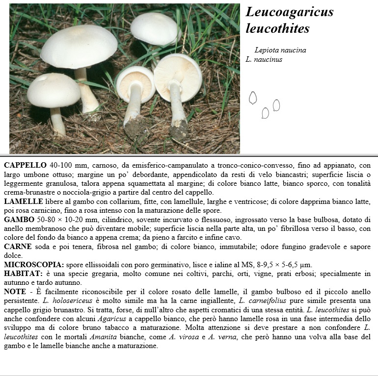 CAPPELLO 40-100 mm, carnoso, da emisferico-campanulato a tronco-conico-convesso, fino ad appianato, con largo umbone ottuso, margine un po' debordante, appendicolato da resti di velo biancastri, superficie liscia o leggermente granulosa talora appena squamettata al margine, di colore bianco latte, bianco sporco, con tonalità crema-brunastre o nocciola-grigio a partire dal centro del cappello. LAMELLE libere al gambo con collarium, fitte, con lamellule, larghe e ventricose, di colore dapprima bianco latte, poi rosa carnicino, fino a rosa intenso con la maturazione delle spore. GAMBO 50-80 x 10-20 mm, cilindrico, sovente incurvato o flessuoso, ingrossato verso la base bulbosa, dotato di anello membranoso che può diventare mobile, superficie liscia nella parte alta, un po' fibrillosa verso il basso, con colore del fondo da bianco a appena crema, da pieno a farcito e infine cavo. CARNE soda e poi tenera, fibrosa nel gambo, di colore bianco, immutabile, odore fungino gradevole e sapore dolce. MICROSCOPIA spore ellissoidali con poro germinativo, lisce e ialine al MS, 8-9,5 x 5-6,5 µm. HABITAT è una specie gregaria, molto comune nei coltici, parchi, orti, vigne, prati erbosi, specialmente in autunno e tardo autunno. NOTE - È facilmente riconoscibile per il colore rosato delle lamelle, il gambo bulboso ed il piccolo anello persistente. L. holosericeus è molto simile ma ha la carne ingiallente, L. carneifolius pure simile presenta una cappello grigio brunastro. Si tratta, forse, di null'altro che aspetti cromatici di una stessa entità. L. leucothites si può anche confondere con alcuni Agariaus a cappello bianco, che però hanno lamelle rosa in una fase intermedia dello sviluppo ma di colore bruno tabacco a maturazione. Molta attenzione si deve prestare a non confondere L. leucothites con le mortali Amanita bianche, come A. virosa e A. verna, che però hanno una volva alla base del gambo e le lamelle bianche anche a maturazione.
