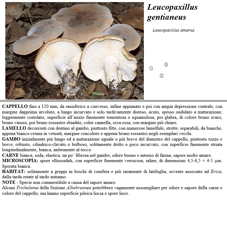 CAPPELLO fino a 120 mm, da emisferico a concesso; infine appianato e poi con ampia depressione centrale, con margine dapprima involuto, a lungo incurvato e solo tardivamente disteso, acuto, spesso ondulato a maturazione, leggermente costolato; superficie all'inizio finemente tomentosa o squamulosa, poi glabra; di colore bruno scuro, bruno vinoso; poi bruno rossastro sbiadito, color cannella, ocra-rosa; con margine più chiaro. LAMELLE decorrenti con dentino al gambo; piuttosto fitte; con numerose lamellule; strette, separabili; da bianche, appena bianco-crema in vetustà: margine concolore o appena bruno rossastro negli esemplari vecchi. GAMBO inizialmente più lungo ed a maturazione uguale o più breve del diametro del cappello; piuttosto tozzo e breve; robusto, cilindrico-slavato o bulboso, solitamente dritto o poco incun-ato; con superficie finemente striata longitudinalmente, bianca. imbrunente al tocco. CARNE bianca, soda; elastica, un po' fibrosa nel gambo; odore buono e intenso di farina, sapore molto amaro. MICROSCOPIA: spore ellissoidali, con superficie finemente verrucosa, ialine, di dimensioni 4,5-6,5 x 4-5 µm. Sporata bianca. HABITAT: solitamente a gruppi in boschi di conifera e più raramente di latifoglia, sovente associato ad Erica; dalla tarda estate al tardo autunno. NOTE - Specie non commestibile a causa del sapore amaro. Alcuni Tricholoma della Sezione Albobrunnea potrebbero vagamente assomigliare per odore e sapore della carne e colore del cappello, ma hanno superficie pileica liscia e spore lisce.