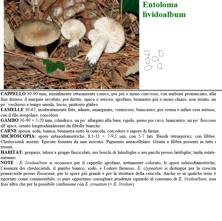 CAPPELLO 30-90 rnm, inizialmente ottusamente conico, poi più o meno convesso, con umbone pronunciato, alla fine disteso, il margine involuto, poi diritto, opaco o sericeo, igrofano, brunastro più o meno chiaro, non striato. un po' vischioso a tempo umido, liscio, piuttosto glabro. LAMELLE 30-65, moderatamente fitte, adnate, smarginate, ventricose, biancastre, poi crema e infine rosa intenso, con il filo irreeolare, concolore. GAMBO 30-90 x 5-20 mm, cilindrico, un po' allargato alla base, rigido, pieno poi cavo, biancastro, un po' fioccoso all'apice, ornato longitudinalmente da fibrille bianche. CARNE spessa, soda, bianca, brunastra sotto la cuticola, con odore e sapore di farina. MICROSCOPIA spore subisodiametriche, 8,5-11 x 7-9,5 um, con 5-7 lati. Basidi tetrasporici, con fibbie. Cheilocistidi assenti. Epicute formata da una ixocutis. Pigmento intracellulare. Giunti a fibbia presenti in tutti i tessuti. HABITAT gregario, talora a gruppi fascicolati, nei boschi di latiufoglie o nei parchi presso latifoglie, tarda estate-autunno. NOTE - E. lividoalbum si riconosce per il cappello igrofano, nettamente colorato, le spore subisodiametriche, l'assenza dei cheilocistidi, il gambo bianco, sodo, e l'odore farinoso. E. clypeatum si distingue per la crescita primaverile presso Rosaceae, per le spore più grandi e per la struttura della cuticola. Anche se in qualche testo è riportato come commestibile, ci pare opportuno consigliare prudenza riguardo al consumo di E. lividoalbum, non foss'altro che per la possibile confusione con E. sinuatum (E. lividum).