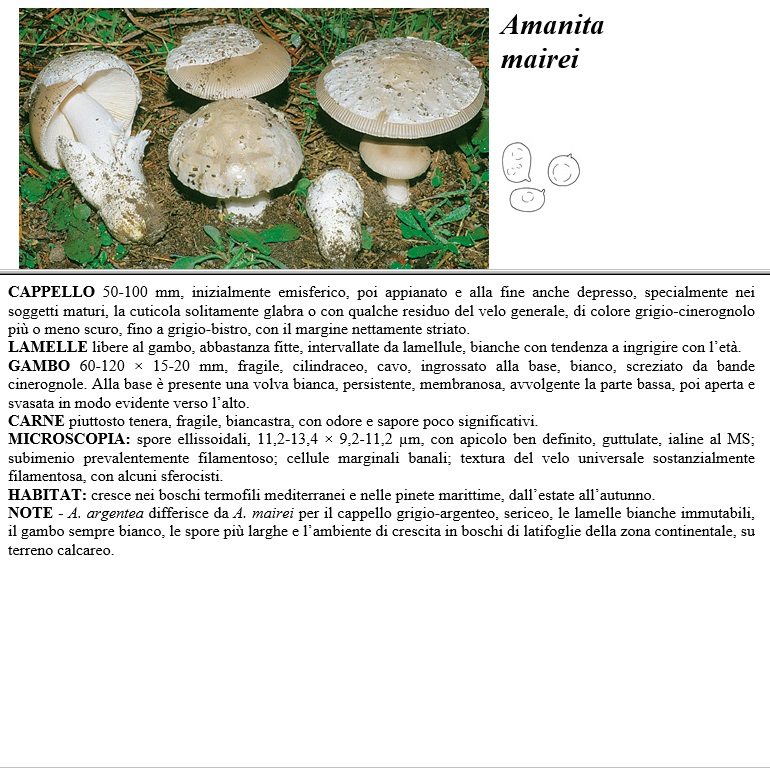 CAPPELLO 50-100 mm, inizialmente emisferico, poi appianato e alla fine anche depresso, specialmente nei soggetti maturi; la cuticola solitamente glabra o con qualche residuo del velo generale, di colore grigio-cinerognolo più o meno scuro, fino a grigio-bistro, con il margine nettamente striato. LAMELLE libere al gambo, abbastanza fitte, intervallate da lamellule, bianche con tendenza a ingrigire con l'età. GAMBO 60-120 x 15-20 mm; fragile, cilindraceo, cavo, ingrossato alla base, bianco, screziato da bande cinerognole. Alla base è presente una volva bianca, persistente, membranosa avvolgente la parte bassa, poi aperta e svasata in modo evidente verso l'alto. CARNE piuttosto tenera; fragile; biancastra, con odore e sapore poco significativi. MICROSPIA spore ellissoidali, 11,2-13,4 x 9,2-11,2 µm; con apicolo ben definito, guttulate, ialine al MS; subimenio prevalentemente filamentoso; cellule marginali banali; textura del velo universale sostanzialmente filamentosa, con alcuni sferocisti. HABITAT: cresce nei boschi termofili mediterranei e nelle pinete marittime, dall'estate all'autunno. NOTE - A. argentea differisce da A. mairei per il cappello grigio-argenteo, sericeo, le lamelle bianche immutabili, il gambo sempre bianco, le spore più larghe e l'ambiente di crescita in boschi di latifoglie della zona continentale, su terreno calcareo.