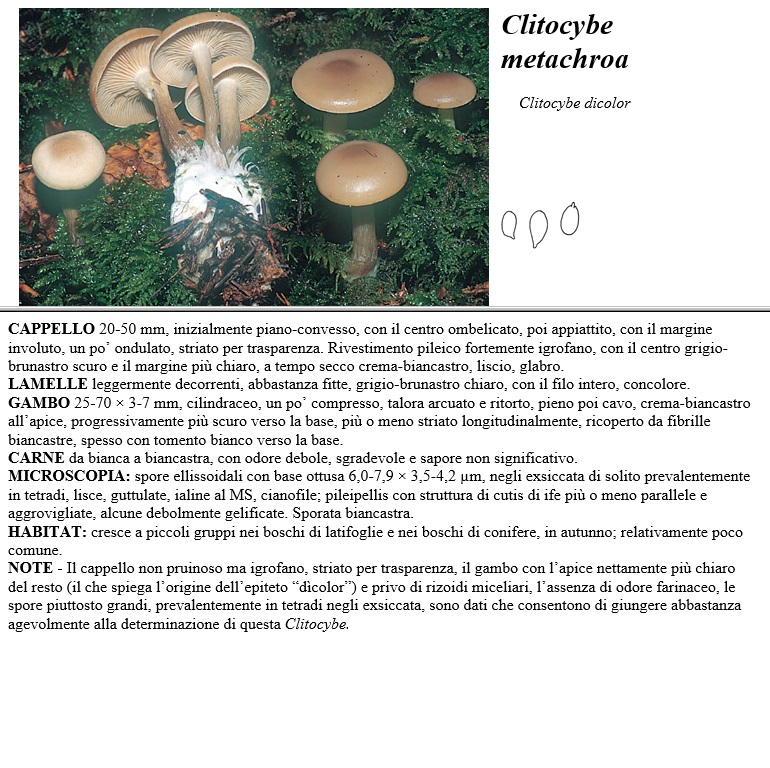 CAPPELLO 20-50 mm, inizialmente piano-convesso, con il centro ombelicato, poi appiattito, con il margine involuto, un po' ondulato, striato per trasparenza. Rivestimento pileico fortemente igrofano, con il centro grigio-brunastro scuro e il margine più chiaro, a tempo secco crema-biancastro, liscio, glabro. LAMELLE leggermente decorrenti, abbastanza fitte, grigio-brunastro chiaro, con il filo intero, concolore. GAMBO 25-70 x 3-7 mm, cilindraceo, un po' compresso, talora arcuato e ritorto, pieno poi cavo, crema-biancastro all'apice, progressivamente più scuro verso la base, più o meno striato longitudinalmente, ricoperto da fibrille biancastre, spesso con tomento bianco verso la base. CARNE da bianca a biancastra- con odore debole, sgradevole e sapore non significativo. MICROSCOPIA spore ellissoidali con base ottusa 6,0-7,9 x 3,5-4,2 µm, negli exsiccata di solito prevalentemente in tetradi, lisce, guttulate, ialine al MS, cianofile, pileipellis con struttura di cutis di ife più o meno parallele e aggrovigliate, alcune debolmente gelificate. Sporata biancastra. HABITAT cresce a piccoli gruppi nei boschi di latifoglie e nei boschi di conifere, in autunno, relativamente poco comune. NOTE - Il cappello non pruinoso ma igrofano, striato per trasparenza, il gambo con l'apice nettamente più chiaro del resto (il che spiega 1'origine dell'epiteto "dicolor") e privo di rizoidi miceliari, l'assenza di odore farinaceo, le spore piuttosto grandi, prevalentemente in tetradi negli exsiccata, sono dati che consentono di giungere abbastanza agevolmente alla determinazione di questa Clitocybe.