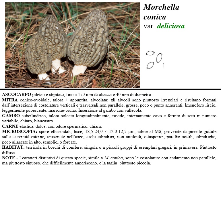 SCOCARPO piletato e stipitato, fino a 150 mm di altezza e 40 mm di diametro. MITRA conico-ovoidale, talora più o meno appuntita, alveolata, gli alveoli sono piuttosto irregolari e risultano formati dall'intersezione di costolature verticali e trasversali non parallele, grosse, poco o punto annerenti. Imenoforo liscio, leggermente pubescente, marrone-bruno. Inserzione al gambo con vallecola. GAMBO subcilindrico, talora solcato longitudinalmente, ruvido, internamente cavo e fornito di setti in numero variabile, chiaro, biancastro. CARNE elastica, dolce, con odore spermatico, chiara. MICROSCOPIA spore ellissoidali, lisce, 18,5-24,0 x 12,0-12,5 µm, ialine al MS, provviste di piccole guttule sulle estremità esterne, uniseriate nell'asco, aschi cilindrici, non amiloidi, ottasporici, parafisi sottili, cilindriche, poco allargate in alto, semplici o forcate. HABITAT terricola in boschi di conifere, singola o a piccoli gruppi di esemplari gregari, in primavera. Piuttosto diffusa. NOTE - I caratteri distintivi di questa specie, simile a M. conica, sono le costolature con andamento non parallelo, ma piuttosto sinuoso, che difficilmente anneriscono, e la taglia piuttosto piccola.