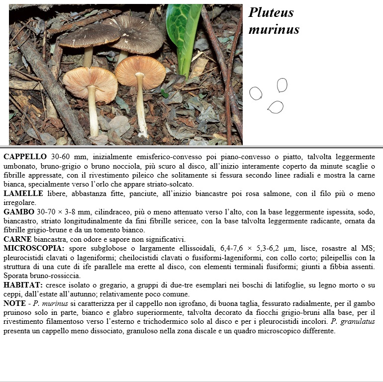 CAPPELLO 30-60 mm, inizialmente emisferico-convesso poi piano-convesso o piatto, talvolta leggermente umbonato; bruno-grigio o bruno nocciola, più scuro al disco, all'inizio interamente coperto da minute scaglie o fibrille appressate, con il rivestimento pileico che solitamente si fessura secondo linee radiali e mostra la carne bianca, specialmente verso l'orlo che appare striato-solcato. LAMELLE libere, abbastanza fitte; panciute, all'inizio biancastre poi rosa salmone, con il filo più o meno irre?olare. GAMBO 30-70 x 3-8 mm, cilindraceo, più o meno attenuato verso l'alto, con la base leggermente ispessita, sodo, biancastro, striato longitudinalmente da fini fibrille sericee, con la base talvolta leggermente radicante; ornata da fibrille erisio-brune e da un tomento bianco. CARNE biancastra, con odore e sapore non significativi. MICROSCOPIA spore subglobose o largamente ellissoidali, 6,4-7,6 x5,3-6,2 µm, lisce, rosastre al MS, pleurocistidi clavati o lageniformi, cheilocistidi clavati o fusiformi-lageniformi, con collo corto, pileipellis con la struttura di una cute di ife parallele ma erette al disco, con elementi terminali fusiformi, giunti a fibbia assenti. Sporata bruno-rossiccia. HABITAT cresce isolato o oregario, a gruppi di due-tre esemplari nei boschi di latifoglie, su legno morto o su ceppi, dall'estate all'autunno, relativamente poco comune. NOTE - P. murinus si caratterizza per il cappello non igrofano, di buona taglia, fessurato radialmente, per il gambo pruinoso solo in parte, bianco e glabro superiormente; talvolta decorato da fiocchi grigio-bruni alla base, per il rivestimento filamentoso verso 1'esterno e trichodermico solo al disco e per i pleurocistidi incolori, P. granulatus presenta un cappello meno dissociato, granuloso nella zona discale e un quadro microscopico differente.