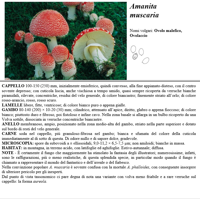 CAPPELLO 100- 150 (250) mm, inizialmente emisferico, quindi convesso, alla fine appianato-disteso, con il centro sovente depresso; con cuticola liscia, anche vischiosa a tempo umido, quasi sempre ricoperta da verruche bianche piramidali, rilevate, concentriche, residui del velo generale, di colore biancastro; finemente striato all'orlo; di colore rosso-arancio, rosso, rosso scuro. LAMELLE libere; fitte, ventricose; di colore bianco puro o appena gialle. GAMBO 80-140 (200) x 10-20 (30) mm; cilindrico, attenuato all'apice, diritto, glabro o appena fioccoso; di colore bianco; piuttosto duro e fibroso, poi fistoloso e infine cavo. Nella zona basale si allarga in un bulbo ricoperto da una VOLVA sottile, dissociata in verruche concentriche biancastre. ANELLO membranoso, ampio; posizionato nella zona medio-alta del gambo, striato nella parte superiore e dotato sul bordo di resti del velo generale. CARNE soda nel cappello, più granuloso-fibrosa nel gambo; bianca e sfumata del colore della cuticola immediatamente al di sotto di questa. Di odore nullo e di sapore dolce, gradevole. MICROSCOPIA spore da subovoidi a più o meno ellissoidali, 9,0-11,2 x 6,5-7,5 µm; non amiloidi; bianche in massa. HABITAT in montagna, in terreno acido, con latifoglie ed aghifoglie. Estivo-autunnale; diffusa. NOTE - E certamente il fungo che maggiormente ha stimolato la fantasia degli illustratori; numerosissime, infatti, sono le raffigurazioni, più o meno realistiche, di questa splendida specie, in particolar modo quando il fungo è chiamato a rappresentare il mondo del fantastico e dell'irreale o del fiabesco. Nella convinzione popolare A. muscaria è sovente confusa con la mortale A. phalloides con conseguente insorgere di ulteriore pericolo per gli inesperti. Dal punto di vista tassonomico ci pare degna di nota una variante con volva meno friabile e a rare verruche sul cappello: la forma aureola.