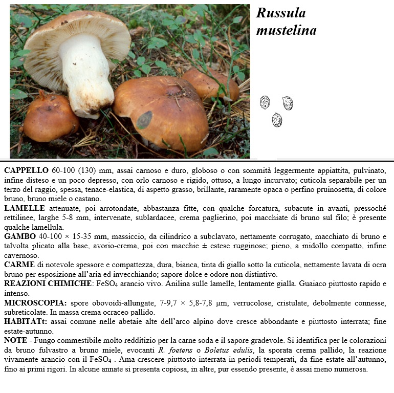 CAPPELLO 60-100 (130) mm, assai carnoso e duro; globoso o con sommità leggermente appiattita pulcinato; infine disteso e un poco depresso, con orlo carnoso e rigido, ottuso, a lungo incurvato; cuticola separabile per un terzo del raggio; spessa, tenace-elastica, di aspetto grasso, brillante, raramente opaca o perfino pruinosetta; di colore bruno, bruno miele o castano. LAMELLE attenuate; poi arrotondate, abbastanza fitte; con qualche forcatura subacute in avanti; pressoché rettilinee, larghe 5-8 mm, intervenate; sublardacee, crema paglierino, poi macchiate di bruno sul filo; è presente qualche lamellula. GAMBO 40-100 x 15-35 mm; massiccio, da cilindrico a subclavato, nettamente corrugato, macchiato di bruno e talvolta plicato alla base, avorio-crema, poi con macchie - estese rugginose; pieno; a midollo compatto, infine cavernoso. CARME di notevole spessore e compattezza, dura, bianca, tinta di giallo sotto la cuticola, nettamente lavata di ocra bruno per esposizione all'aria ed invecchiando; sapore dolce e odore non distintivo. REAZIONI CHIMICHE FeSO4 arancio vivo. Anilina sulle lamelle, lentamente gialla. Guaiaco piuttosto rapido e intenso. MICROSCOPIA spore obocoidi-allungate. 7-9,7 x 5,8-7,8 µm, verrucolose, cristulate, debolmente connesse; subreticolate. In massa crema ocraceo pallido. HABITAT assai comune nelle abetaie alte dell'arco alpino dove cresce abbondante e piuttosto interrata; fine estate-autunno. NOTE - Fungo commestibile molto redditizio per la carne soda e il sapore gradevole. Si identifica per le colorazioni da bruno fulvastro a bruno miele, evocanti R. foetens o Boletus edulis, la sporata crema pallido, la reazione vivamente arancio con il FeSO4 . Ama crescere piuttosto interrata in periodi temperati; da fine estate all'autunno; fino ai primi rigori. In alcune annate si presenta copiosa, in altre; pur essendo presente, è assai meno numerosa.