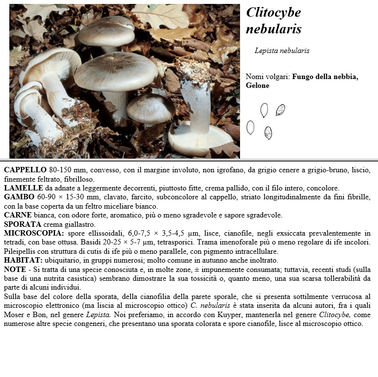CAPPELLO 80-150 mm, convesso, con il margine incoluto, non igrofano, da grigio cenere a grigio-bruno, liscio, finemente feltrato, fibrilloso. LAMELLE da adnate a leggermente decorrenti, piuttosto fitte, crema pallido, con il filo intero, concolore. GAMBO 60-90 x 15-30 mm, clavato, farcito, subconcolore al cappello, striato longitudinalmente da fini fibrille, con la base coperta da un feltro miceliare bianco. CARNE bianca, con odore forte, aromatico, più o meno sgradevole e sapore sgradevole. SPOR,-kTA crema giallastro. MICROSCOPIA spore ellissoidali, 6,0-7,5 x 3,5-4,5 µm, lisce, cianofile, negli essiccata prevalentemente in tetradi, con base ottusa. Basidi 20-25 x 5-7 µm, tetrasporici. Trama imenoforale più o meno regolare di ife incolori. Pileipellis con struttura di cutis di ife più o meno parallele, con pigmento inuacellulare. HABITAT ubiquitario, in gruppi numerosi, molto comune in autunno anche inoltrato. NOTE - Si tratta di una specie conosciuta e, in molte zone, - impunemente consumata, tuttavia, recenti studi (sulla base di una nutrita casistica) sembrano dimostrare la sua tossicità o, quanto meno, una sua scarsa tollerabilità da parte di alcuni individui. Sulla base del colore della sporata, della cianofilia della parete sporale, che si presenta sottilmente verrucosa al microscopio elettronico (ma liscia al microscopio ottico) C. nebularis è stata inserita da alcuni autori, fra i quali Vtoser e Bon, nel genere Lepista. Noi preferiamo, in accordo con Kuyper; mantenerla nel genere Clitocybe, come numerose altre specie congeneri, che presentano una sporata colorata e spore cianofile, lisce al microscopio ottico.