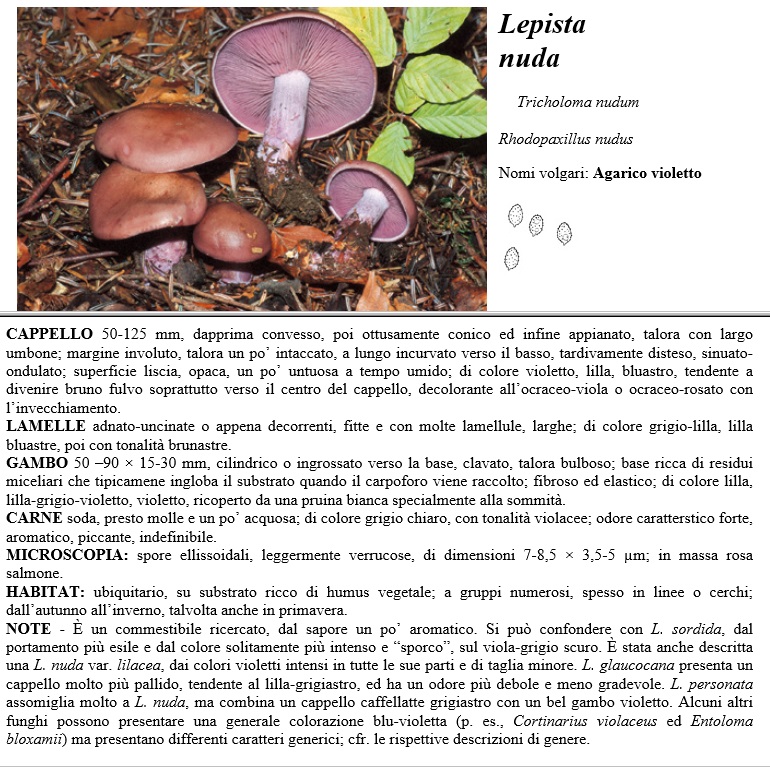 CAPPELLO 50-125 mm, dapprima convesso, poi ottusamente conico ed infine appianato, talora con largo umbone, margine involuto, talora un po' intaccato, a lungo incurvato verso il basso, tardivamente disteso, sinuato-ondulato, superficie liscia opaca, un po' untuosa a tempo umido, di colore violetto, lilla, bluastro, tendente a divenire bruno fulvo soprattutto verso il centro del cappello, decolorante all'ocraceo-viola o ocraceo-rosato con l'invecchiamento. LAMELLE adnato-uncinate o appena decorrenti, fitte e con molte lamellule, larghe, di colore grigio-lilla lilla bluastre, poi con tonalità brunastre. GAMBO 50 -90 x 15-30 mm, cilindrico o ingrossato verso la base, clavato, talora bulboso, base ricca di residui miceliari che tipicamene ingloba il substrato quando il carpoforo viene raccolto, fibroso ed elastico, di colore lilla, lilla-grigio-violetto, violetto, ricoperto da una pruina bianca specialmente alla sommità. CARNE soda, presto molle e un po' acquosa, di colore grigio chiaro, con tonalità violacee, odore caratterstico forte, aromatico, piccante, indefinibile. MICROSCOPIA spore ellissoidali, leggermente verrucose, di dimensioni 7-8,5 x 3,5-5 µm, in massa rosa salmone. HABITAT ubiquitario, su substrato ricco di humus vegetale, a gruppi numerosi, spesso in linee o cerchi, dall'autunno all'inverno, talvolta anche in primavera. NOTE - È un commestibile ricercato, dal sapore un po' aromatico. Si può confondere con L. sordida, dal portamento più esile e dal colore solitamente più intenso e "sporco", sul viola-grigio scuro. E stata anche descritta una L. nuda var. lilacea, dai colori violetti intensi in tutte le sue parti e di taglia minore. L. glaucocana presenta un cappello molto più pallido, tendente al lilla-grigiastro, ed ha un odore più debole e meno gradevole. L. personata assomiglia molto a L. aaua'a, ma combina un cappello caffellatte grigiastro con un bel gambo violetto. Alcuni altri funghi possono presentare una generale colorazione blu-violetta (Cortinarius violaceus ed Entoloraaa bloxamii) ma presentano differenti caratteri generici.