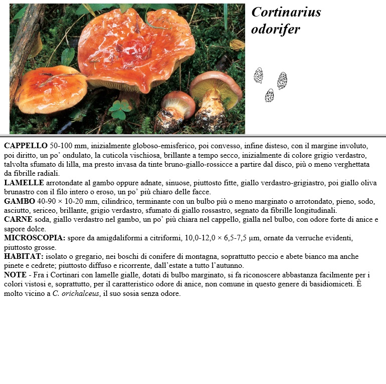CAPPELLO 50-100 mm, inizialmente globoso-emisferico, poi coneesso, infine disteso, con il margine involuto, poi diritto, un po' ondulato, la cuticola vischiosa, brillante a tempo secco, inizialmente di colore grigio verdastro, talvolta sfumato di lilla, ma presto invasa da tinte bruno-giallo-rossicce a partire dal disco, più o meno verghettata da fibrille radiali. LAMELLE arrotondate al gambo oppure adnate, sinuose, piuttosto fitte, giallo verdastro-grigiastro, poi giallo oliva brunastro con il filo intero o eroso, un po' più chiaro delle facce. GAMBO 40-90 x 10-20 mm, cilindrico, terminante con un bulbo più o meno marginato o arrotondato, pieno, sodo, asciutto, sericeo, brillante, grigio verdastro, sfumato di giallo rossastro, segnato da fibrille longitudinali. CARNE soda, giallo verdastro nel gambo, un po' più chiara nel cappello, gialla nel bulbo, con odore forte di anice e sapore dolce. MICROSCOPIA spore da amigdaliformi a citriformi, 10,0-12,0 x 6,5-7,5 µm, ornate da verruche evidenti, piuttosto grosse. HABITAT isolato o gregario, nei boschi di conifere di montagna, soprattutto peccio e abete bianco ma anche pinete e cedrete, piuttosto diffuso e ricorrente, dall'estate a tutto l'autunno. NOTE - Fra i Cortinari con lamelle gialle, dotati di bulbo marginato, si fa riconoscere abbastanza facilmente per i colori vistosi e, soprattutto, per il caratteristico odore di anice, non comune in questo genere di basidiomiceti. E' molto vicino a C. orichalceus, il suo sosia senza odore.