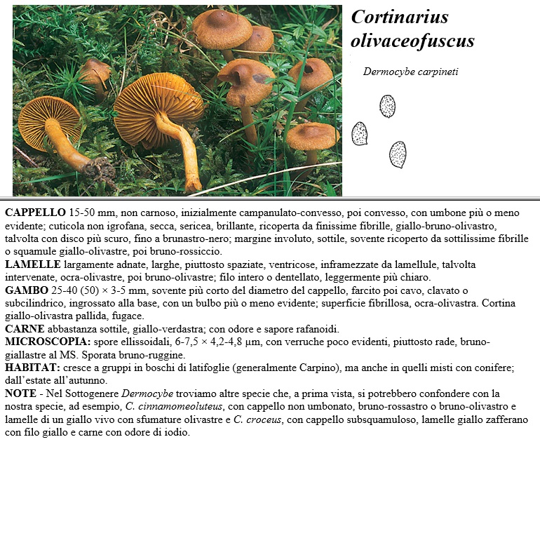 CAPPELLO 15-50 mm, non carnoso, inizialmente campanulato-convesso, poi convesso, con umbone più o meno evidente, cuticola non igrofana, secca, sericea, brillante, ricoperta da finissime fibrille, giallo-bruno-olivastro, talvolta con disco più scuro, fino a brunastro-nero, margine involuto, sottile, sovente ricoperto da sottilissime fibrille o squamule giallo-olivastre, poi bruno-rossiccio. LAMELLE largamente adnate, larghe, piuttosto spaziate, ventricose, inframezzate da lamellule, talvolta intervenate, ocra-olivastre, poi bruno-olivastre, filo intero o dentellato, leggermente più chiaro. GAMBO 25-40 (50) x 3-5 mm, sovente più corto del diametro del cappello, farcito poi cavo, clavato o subcilindrico, ingrossato alla base, con un bulbo più o meno evidente, superficie fibrillosa, ocra-olivastra. Cortina giallo-olivastra pallida, fugace. CARNE abbastanza sottile, giallo-verdastra, con odore e sapore rafanoidi. MICROSCOPIA spore ellissoidali, 6-7,5 x 4,2-4,8 µm, con verruche poco evidenti, piuttosto rade, bruno-giallastre al MS. Sporata bruno-ruggine. HABITAT cresce a gruppi in boschi di latifoglie (generalmente Carpino), ma anche in quelli misti con conifere, dall'estate all'autunno. NOTE -Nel Sottogenere Dermocybe troviamo altre specie che, a prima vista, si potrebbero confondere con la nostra specie, ad esempio, C. cinnamomeoluteus, con cappello non umbonato, bruno-rossastro o bruno-olivastro e lamelle di un giallo vivo con sfumature olivastre e C. croceus; con cappello subsquamuloso, lamelle giallo zafferano con filo giallo e carne con odore di iodio.