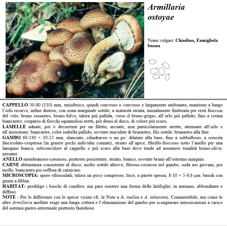 CAPPELLO 30-80 (110) mm, emisferico, quindi convesso o convesso e largamente umbonato, mantiene a lungo l'orlo ricurvo, infine disteso, con zona marginale sottile, a maturità striata inizialmente fimbriata per resti fioccosi del velo, bruno rossastro, bruno-fulvo, talora più pallida, verso il bruno-grigio, all'orlo più pallido, fino a crema biancastro, cosparso di fiocchi squamulosi eretti, più densi al disco, di colore più scuro. LAMELLE adnate, poi più o meno decorrenti per un filetto, arcuate, non particolarmente strette, attenuate all'orlo e all'inserzione, biancastre, color isabella pallido, sovente maculate di brunastro, filo sottile, brunastro alla fine. GAMBO 60-140 x 10-22 mm, slanciato, cilindraceo o un po' dilatato alla base, fino a subbulboso, a crescita fascicolato-cespitosa (in genere pochi individui connati), striato all'apice, fibrillo-fioccoso sotto l'anello per una lanugine bianca, subconcolore al cappello o più scuro alla base dove tende ad assumere tonalità bruno-oliva-nersatre. ANELLO membranoso-cotonoso, piuttosto persistente, striato, bianco, sovente bruno all'estremo margine. CARNE abbastanza consistente al disco, molto sottile altrove, fibroso-coriacea nel gambo, soda nei giovani, poi molle, biancastra poi soffusa di carnicino. MICROSCOPIA spore ellissoidali, talora un poco compresse, lisce, a parete spessa, 8-10 x 5-6,6 µm, basidi con giunti a fibbia. HABITAT predilige i boschi di conifere, ma pare esistere una forma delle latifoglie, in autunno, abbondante e diffuso. NOTE - Per le differenze con le specie vicine (cfr. le Note a A. mellea e A. tabescens). Commestibile, ma come le altre Armillaria anellate esige una lunga cottura e 1'eliminazione del gambo per scongiurare intossicazioni a carico del sistema gastro-intestinale piuttosto fastidiose.