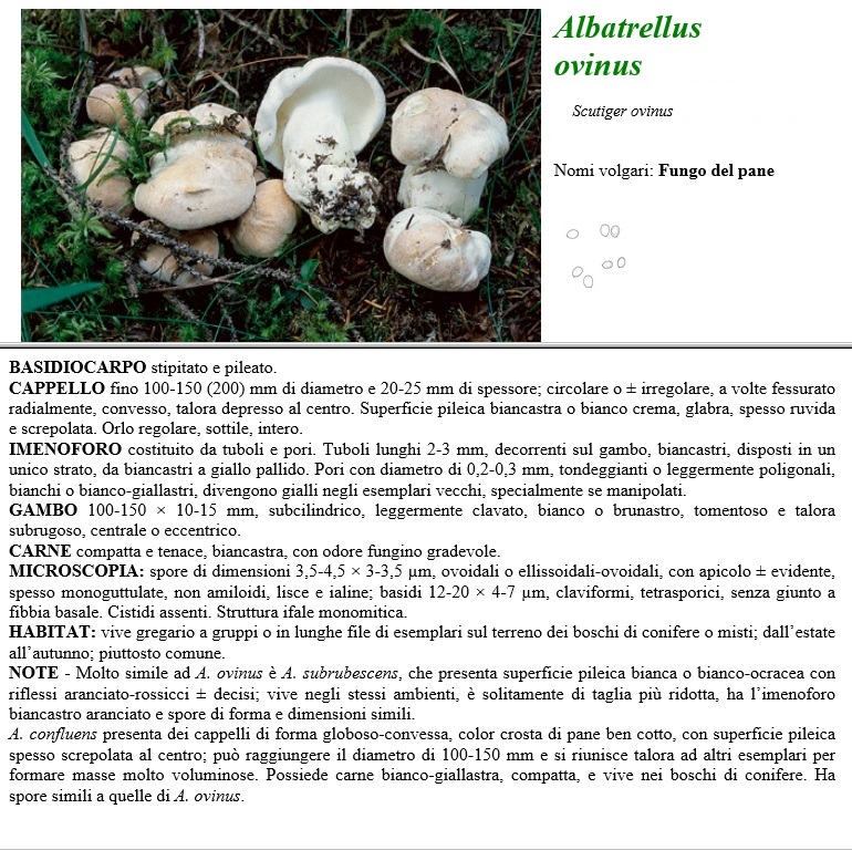 BASIDIOCARPO stipitato e pileato; CAPPELLO fino 100-150 (200) mm di diametro e 20-25 mm di spessore; circolare più o meno irregolare, a volte fessurato radialmente, convesso, talora depresso al centro. Superficie pileica biancastra o bianco crema, glabra, spesso ruvida e screpolata. Orlo regolare, sottile, intero. IDIEVOFORO costituito da tuboli e pori. Tuboli lunghi 2-3 mm, decorrenti sul gambo, biancastri, disposti in un unico strato, da biancastri a giallo pallido. Pori con diametro di 0,2-0,3 mm, tondeggianti o leggermente poligonali, bianchi o bianco-giallastri, divengono gialli negli esemplari vecchi, specialmente se manipolati. GAMBO 100-150 x 10-15 mm, subcilindrico, leggermente clavato, bianco o brunastro, tomentoso e talora subrugoso, centrale o eccentrico. CARNE compatta e tenace, biancastra, con odore fungino gradevole MICROSCOPIA spore di dimensioni 3,5-4,5 x 3-3,5 µm, ovoidali o ellissoidali-ovoidali, con apicolo più o meno evidente, spesso monoguttulate, non amiloidi, lisce e ialine; basidi 12-20 x 4-7 µm, claviformi, tetrasporici, senza giunto a fibbia basale. Cistidi assenti. Struttura ifale monomitica. HABITAT vive gregario a gruppi o in lunghe file di esemplari sul terreno dei boschi di conifere o misti; dall'estate all'autunno; piuttosto comune. NOTE - Molto simile ad A. ovinus A. subrubescens, che presenta superficie pileica bianca o bianco-ocracea con riflessi aranciato-rossicci più o meno decisi; vive negli stessi ambienti, è solitamente di taglia più ridotta, ha l'imenoforo biancastro aranciato e spore di forma e dimensioni simili. A. Confluens presenta dei cappelli di forma globoso-convessa, color crosta di pane ben cotto, con superficie pileica spesso screpolata al centro; può raggiungere il diametro di 100-150 mm e si riunisce talora ad altri esemplari per formare masse molto voluminose. Possiede carne bianco-giallastra; compatta, e vive nei boschi di conifere. Ha spore simili a quelle di A. ovinus