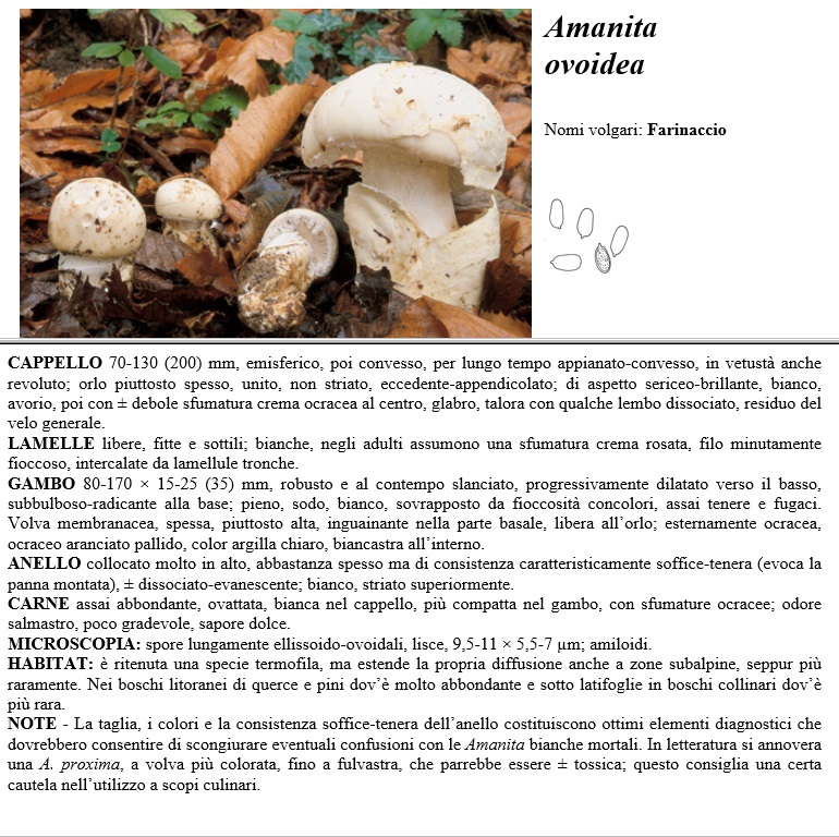 CAPPELLO 70-130 (200) mm, emisferico, poi convesso, per lungo tempo appianato-convesso, in vetustà anche revoluto; orlo piuttosto spesso, unito, non striato, eccedente-appendicolato; di aspetto sericeo-brillante, bianco, avorio, poi con più o meno debole sfumatura crema ocracea al centro, glabro, talora con qualche lembo dissociato, residuo del velo generale. LAMELLE libere, fitte e sottili; bianche, negli adulti assumono una sfumatura crema rosata, filo minutamente fioccoso, intercalate da lamellule tronche. GAMBO 80-170 x 15-25 (35) mm, robusto e al contempo slanciato, progressivamente dilatato verso il basso; subbulboso-radicante alla base, pieno, sodo, bianco, sovrapposto da fioccosità concolori, assai tenere e fugaci. VOLVA membranacea, spessa, piuttosto alta, inguainante nella parte basale, libera all'orlo; esternamente ocracea, ocraceo aranciato pallido, color argilla chiaro, biancastra all'interno. ANELLO collocato molto in alto, abbastanza spesso ma di consistenza caratteristicamente soffice-tenera (evoca la panna montata), più o meno dissociato-evanescente: bianco, striato superiormente. CARNE assai abbondante, ovattata, bianca nel cappello, più compatta nel gambo, con sfumature ocracee, odore salmastro, poco gradevole, sapore dolce. MICROSCOPIA spore lungamente ellissoido-ovoidali, lisce, 9,5-11 x 5,5-7 um; amiloidi. HABITAT è ritenuta una specie termofila, ma estende la propria diffusione anche a zone subalpine, seppur più raramente. Nei boschi litoranei di querce e pini dov'è molto abbondante e sotto latifoglie in boschi collinari dov'è più rara. NOTE - La taglia, i colori e la consistenza soffice-tenera dell'anello costituiscono ottimi elementi diagnostici che dovrebbero consentire di scongiurare eventuali confusioni con le Amanita bianche mortali. In letteratura si annovera una A. proxima a volva più colorata, fino a fulvastra che parrebbe essere più o meno tossica; questo consiglia una certa cautela nell'utilizzo a scopi culinari.