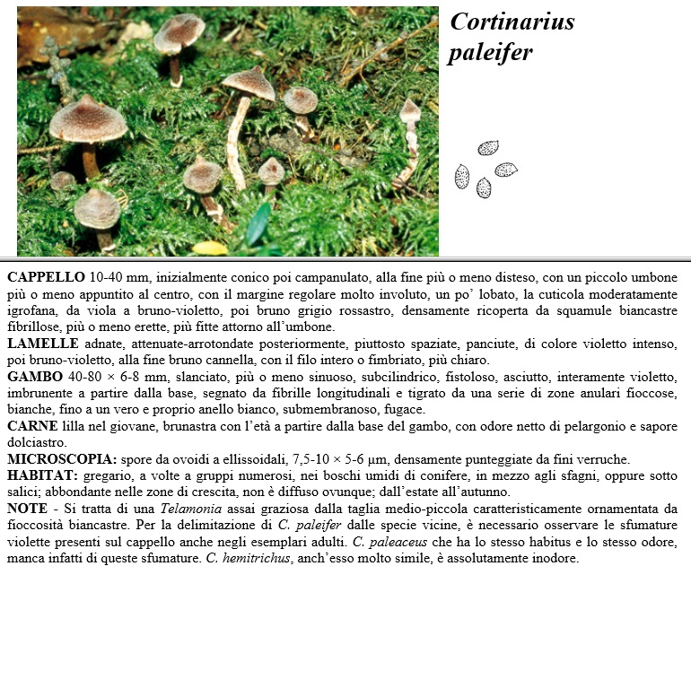 CAPPELLO 10-40 mm, inizialmente conico poi campanulato, alla fine più o meno disteso, con un piccolo umbone più o meno appuntito al centro, con il margine regolare molto involuto, un po' lobato, la cuticola moderatamente igrofana, da viola a bruno-violetto, poi bruno grigio rossastro, densamente ricoperta da squamule biancastre fibrillose, più o meno erette, più fitte attorno all'umbone. LAMELLE adnate, attenuate-arrotondate posteriormente, piuttosto spaziate, panciute, di colore violetto intenso, poi bruno-violetto, alla fine bruno cannella con il filo intero o fimbriato, più chiaro. GAMBO 40-80 x 6-8 mm, slanciato, più o meno sinuoso, subcilindrico, fistoloso, asciutto, interamente violetto, imbrunente a partire dalla base, segnato da fibrille longitudinali e tigrato da una serie di zone anulari fioccose, bianche, fino a un vero e proprio anello bianco, submembranoso, fugace. CARNE lilla nel giovane, brunastra con l'età a partire dalla base del gambo, con odore netto di pelargonio e sapore dolciastro. MICROSCOPIA spore da ovoidi a ellissoidali, 7,5-10 x 5-6 µm, densamente punteggiate da fini verruche. HABITAT gresario, a volte a gruppi numerosi, nei boschi umidi di conifere, in mezzo agli sfagni, oppure sotto salici, abbondante nelle zone di crescita, non è diffuso ovunque, dall'estate all'autunno. NOTE - Si tratta di una Telamonia assai graziosa dalla taglia medio-piccola caratteristicamente ornamentata da fioccosità biancastre. Per la delimitazione di C. paleifer dalle specie vicine, è necessario osservare le sfumature violette presenti sul cappello anche negli esemplari adulti. C. paleaceus che ha lo stesso habitus e lo stesso odore, manca infatti di queste sfumature. C. hemitrichus, anch'esso molto simile, è assolutamente inodore.