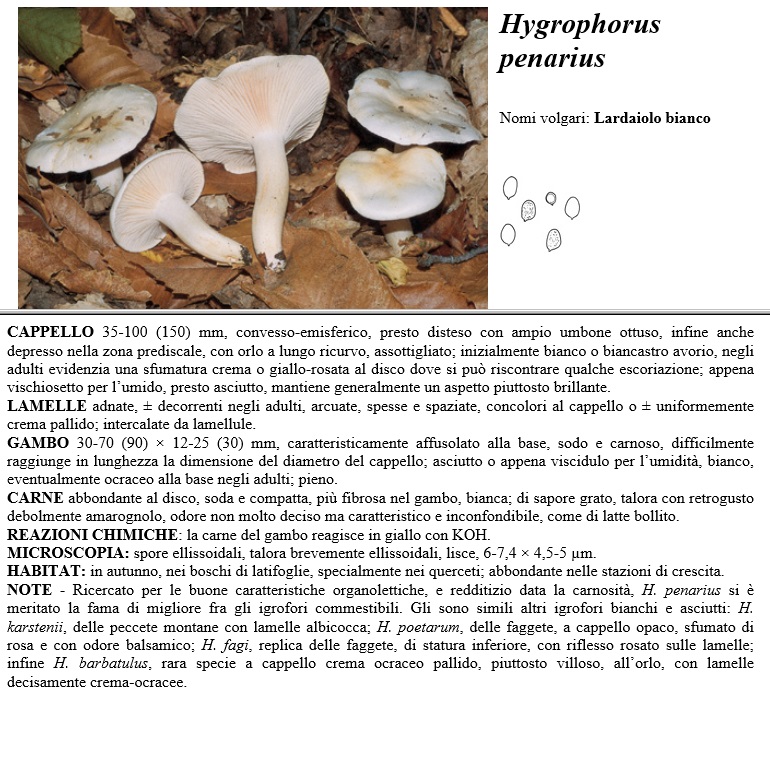CAPPELLO 35-100 (150) mm, convesso-emisferico, presto disteso con ampio umbone ottuso, infine anche depresso nella zona prediscale, con orlo a lungo ricurvo, assottigliato, inizialmente bianco o biancastro avorio, negli adulti evidenzia una sfumatura crema o giallo-rosata al disco dove si può riscontrare qualche escoriazione, appena vischiosetto per l'umido, presto asciutto, mantiene generalmente un aspetto piuttosto brillante. LAMELLE adnate, più o meno decorrenti negli adulti, arcuate, spesse e spaziate, concolori al cappello o più o meno uniformemente crema pallido, intercalate da lamellule. GAMBO 30-70 (90) x 12-25 (30) mm, caratteristicamente affusolato alla base, sodo e carnoso, difficilmente raggiunge in lunghezza la dimensione del diametro del cappello, asciutto o appena viscidulo per l'umidità, bianco, eventualmente ocraceo alla base negli adulti, pieno. CARNE abbondante al disco, soda e compatta, più fibrosa nel gambo, bianca, di sapore grato, talora con retrogusto debolmente amarognolo, odore non molto deciso ma caratteristico e inconfondibile, come di latte bollito. REAZIONI CHIMICHE la carne del gambo reagisce in giallo con KOH. MICROSCOPIA spore ellissoidali, talora brevemente ellissoidali, lisce, 6-7,4 x 4,5-5 µm. HABITAT in autunno, nei boschi di latifoglie, specialmente nei querceti, abbondante nelle stazioni di crescita. NOTE - Ricercato per le buone caratteristiche organolettiche, e redditizio data la carnosità H. penarius si è meritato la fama di migliore fra gli igrofori commestibili. Gli sono simili altri igrofori bianchi e asciutti: H. karstenii, delle peccete montane con lamelle albicocca, H. poetarum, delle faggete, a cappello opaco, sfumato di rosa e con odore balsamico, H. fagi, replica delle faggete, di statura inferiore, con riflesso rosato sulle lamelle, infine H. barbatulus, rara specie a cappello crema ocraceo pallido, piuttosto villoso, all'orlo, con lamelle decisamente crema-ocracee.