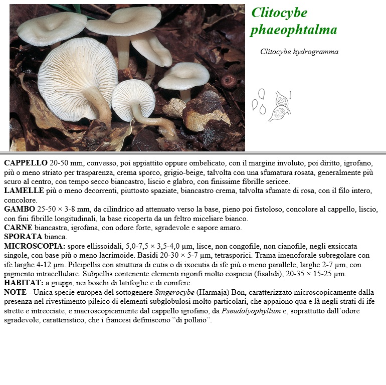 CAPPELLO 20-50 mm, convesso, poi appiattito oppure ombelicato, con il margine involuto, poi diritto, igrofano, più o meno striato per trasparenza, crema sporco, grigio-beige, talvolta con una sfumatura rosata, generalmente più scuro al centro, con tempo secco biancastro, liscio e glabro, con finissime fibrille sericee. LAMELLE più o meno decorrenti, piuttosto spaziate, biancastro crema, talvolta sfumate di rosa, con il filo intero, concolore. GAMBO 25-50 x 3-8 mm, da cilindrico ad attenuato verso la base, pieno poi fistoloso, concolore al cappello, liscio, con fini fibrille longitudinali, la base ricoperta da un feltro miceliare bianco. CARNE biancastra, igrofana, con odore forte, sgradevole e sapore amaro. SPORATA bianca. MICROSCOPIA spore ellissoidali, 5,0-7,5 x 3,5-4,0 µm, lisce, non congofile, non cianofile, negli exsiccata singole, con base più o meno lacrimoide. Basidi 20-30 x 5-7 µm, tetrasporici. Trama imenoforale subregolare con ife larghe 4-12 µm. Pileipellis con struttura di cutis o di ixocutis di ife più o meno parallele, larghe 2-7 µm, con pigmento intracellulare. Subpellis contenente elementi rigonfi molto cospicui (fisalidi), 20-35 x 15-25, µm. HABITAT a gruppi, nei boschi di latifoglie e di conifere. NOTE - Unica specie europea del sottogenere Singerocybe (Harmaja) Bon, caratterizzato microscopicamente dalla presenza nel rivestimento pileico di elementi subglobulosi molto particolari, che appaiono qua e là negli strati di ife strette e intrecciate, e macroscopicamente dal cappello igrofano, da Pseudolyophyllum e, soprattutto dall'odore sgradevole, caratteristico, che i francesi definiscono "di pollaio".