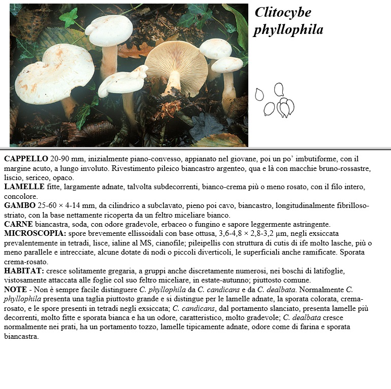 CAPPELLO 20-90 mm, inizialmente piano-convesso, appianato nel giovane, poi un po' imbutiforme, con il margine acuto, a lungo involuto. Rivestimento pileico biancastro argenteo, qua e là con macchie bruno-rossastre, liscio, sericeo, opaco. LAMELLE fitte, largamente adnate, talvolta subdecorrenti, bianco-crema più o meno rosato, con il filo intero, concolore. GAMBO 25-60 x 4-14 mm, da cilindrico a subclavato, pieno poi cavo, biancastro, longitudinalmente fibrilloso-striato, con la base nettamente ricoperta da un feltro miceliare bianco. CARNE biancastra, soda, con odore gradevole, erbaceo o fungino e sapore leggermente astringente. MICROSCOPIA spore brevemente ellissoidali con base ottusa, 3,6-4,8 x 2,8-3,2 µm, negli exsiccata prevalentemente in tetradi, lisce, ialine al MS, cianofile, pileipellis con struttura di cutis di ife molto lasche, più o meno parallele e intrecciate, alcune dotate di nodi o piccoli diverticoli, le superficiali anche ramificate. Sporata crema-rosato. HABITAT cresce solitamente gregaria, a gruppi anche discretamente numerosi, nei boschi di latifoglie, vistosamente attaccata alle foglie col suo feltro miceliare, in estate-autunno, piuttosto comune. NOTE - Non è sempre facile distinguere C. phyllophila da C. candicans e da C. dealbata. Normalmente C. phyllophila presenta una taglia piuttosto grande e si distingue per le lamelle adnate, la sporata colorata, crema-rosato, e le spore presenti in tetradi negli exsiccata, C. candicans, dal portamento slanciato, presenta lamelle più decorrenti, molto fitte e sporata bianca e ha un odore, caratteristico, molto gradevole, C. dealbata cresce normalmente nei prati, ha un portamento tozzo, lamelle tipicamente adnate, odore come di farina e sporata biancastra.