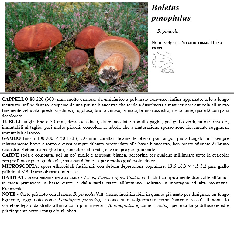 CAPPELLO 80-220 (300) mm, molto carnoso, da emisferico a pulvinato-convesso, infine appianato, orlo a lungo incurvato, infine disteso, cosparso da una pruina biancastra che tende a dissolversi a maturazione, cuticola all'inizio finemente cellutata, presto vischiosa, rugolosa, bruno vinoso, granata, bruno rossastro, rosso rame, qua e là con parti decolorate. TUBULI lunghi fino a 30 mm, depresso-adnati, da bianco latte a giallo paglia, poi giallo-verdi, infine olicastri, immutabili al taglio, pori molto piccoli, concolori ai tuboli, che a maturazione spesso sono lievemente rugginosi, immutabili al tocco. GAMBO fino a 100-200 x 50-120 (150) mm, caratteristicamente obeso, poi un po' più allungato, ma sempre relativamente breve e tozzo e quasi sempre dilatato-arrotondato alla base, biancastro, ben presto sfumato di bruno rossastro. Reticolo a maglie fini, concolore al fondo, che ricopre per gran parte. CARNE soda e compatta, poi un po' molle e acquosa, bianca, porporina per qualche millimetro sotto la cuticola, con profumo tipico, gradevole, ma assai debole, sapore molto gradevole, dolce. MICROSCOPIA spore ellissoidali-fusiformi, con debole depressione soprailare, 13,6-16,3 x 4,5-5,2 µm, giallo pallido al MS, bruno olivastro in massa. HABITAT prevalentemente associato a Picea, Pinus, Fagus, Castanea. Fruttifica tipicamente due volte all'anno, in tarda primavera, a basse quote, e dalla tarda estate all'autunno inoltrato in montagna ed alta montagna. Ricorrente. NOTE - Certo più noto con il nome B. pinicola Vitt. (nome inutilizzabile in quanto già usato per designare un fungo lignicolo, oggi noto come Fomitopsis pinicola), è conosciuto volgarmente come "porcino rosso". Il nome lo vorrebbe legato da stretta affinità con i pini, invece il B. pinophilus è, come 1'edulis, specie di larga diffusione ed è più frequente sotto i faggi e/o gli abeti.