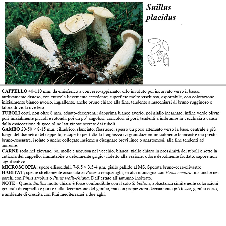 CAPPELLO 40-110 mm, da emisferico a convesso-appianato, orlo involuto poi incurvato verso il basso, tardivamente disteso, con cuticola lievemente eccedente, superficie molto vischiosa asportabile, con colorazione inizialmente bianco avorio, ingiallente, anche bruno chiaro alla fine, tendente a macchiarsi di bruno rugginoso o talora di viola ove lesa. TUBOLI corti, non oltre 8 mm, adnato-decorrenti, dapprima bianco avorio, poi giallo incarnato, infine verde oliva, pori inizialmente piccoli e rotondi, poi un po' angolosi, concolori ai pori, tendenti a imbrunire in vecchiaia a causa dalla essiccazione di goccioline lattiginose secrete dai tuboli. GAMBO 20-50 x 8-15 mm, cilindrico, slanciato, flessuoso, spesso un poco attenuato verso la base, centrale e più lungo del diametro del cappello, ricoperto per tutta la lunghezza da granulazioni inizialmente biancastre ma presto bruno-rossastre, isolate o anche collegate insieme a disegnare brevi linee o anastomosi, alla fine tendenti ad annerire. CARNE soda nel giocane, poi molle e acquosa nel vecchio, bianca, giallo chiaro in prossimità dei tuboli e sotto la cuticola del cappello, immutabile o debolmente grigio-violetto alla sezione, odore debolmente fruttato, sapore non significativo. MICROSCOPIA spore ellissoidali, 7-9,5 x 3,5-4 µm, giallo pallido al MS. Sporata bruno-ocra-olivastro. HABITAT specie strettamente associata ai Pinus a cinque aghi, in alta montagna con Pinus cembra, ma anche nei parchi con Pinus strobus o Pinus walli-chiana. Dall'estate all'autunno inoltrato. NOTE - Questo Suillus molto chiaro è forse confondibile con il solo S. bellinii, abbastanza simile nelle colorazioni generali di cappello e pori e nella decorazione del gambo, ma con proporzioni decisamente più tozze, gambo corto, e ambiente di crescita con Pini mediterranei a due aghi.