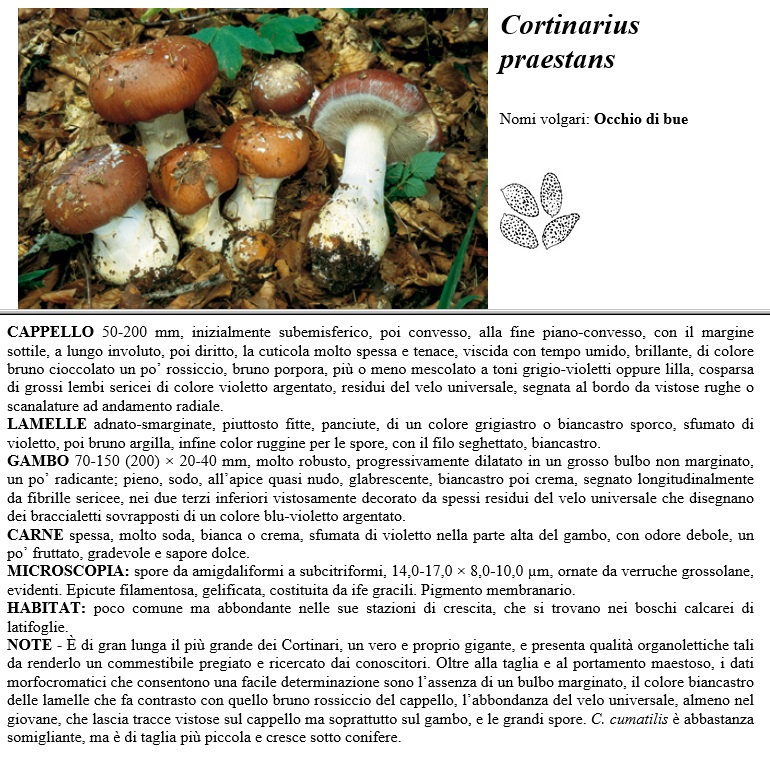 CAPPELLO 50-200 mm, inizialmente subemisferico, poi convesso, alla fine piano-convesso, con il margine sottile, a lungo involuto, poi diritto, la cuticola molto spessa e tenace, viscida con tempo umido, brillante, di colore bruno cioccolato un po' rossiccio, bruno porpora, più o meno mescolato a toni grigio-violetti oppure lilla, cosparsa di grossi lembi sericei di colore violetto argentato, residui del velo universale, segnata al bordo da vistose rughe o scanalature ad andamento radiale. LAMELLE adnato-smarginate, piuttosto fitte, panciute, di un colore grigiastro o biancastro sporco, sfumato di violetto, poi bruno argilla infine color ruggine per le spore, con il filo seghettato, biancastro. GAMBO 70-150 (200) x 20-40 mm, molto robusto, progressivamente dilatato in un grosso bulbo non marginato, un po' radicante, pieno, sodo, all'apice quasi nudo, glabrescente, biancastro poi crema, segnato longitudinalmente da fibrille sericee, nei due terzi inferiori vistosamente decorato da spessi residui del velo universale che disegnano dei braccialetti sovrapposti di un colore blu-violetto argentato. CARNE spessa, molto soda, bianca o crema, sfumata di violetto nella parte alta del gambo, con odore debole, un po' fruttato, gradevole e sapore dolce. MICROSCOPIA spore da amigdaliformi a subcitriformi, 14,0-17,0 x 8,0-10,0 µm, ornate da verruche grossolane, evidenti. Epicute filamentosa, gelificata, costituita da ife gracili. Pigmento membranario. HABITAT poco comune ma abbondante nelle sue stazioni di crescita, che si trovano nei boschi calcarei di latifoglie. NOTE - E di gran lunga il più grande dei Cortinari, un vero e proprio gigante, e presenta qualità organolettiche tali da renderlo un commestibile pregiato e ricercato dai conoscitori. Oltre alla taglia e al portamento maestoso, i dati morfocromatici che consentono una facile determinazione sono Passenza di un bulbo marginato, il colore biancastro delle lamelle che fa contrasto con quello bruno rossiccio del cappello, l'abbondanza del velo universale, almeno nel giovane, che lascia tracce vistose sul cappello ma soprattutto sul gambo, e le grandi spore. C. cumatilis è abbastanza somigliante, ma è di taglia più piccola e cresce sotto conifere.
