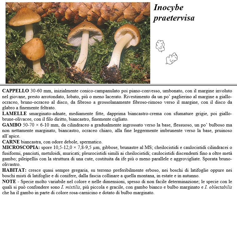 CAPPELLO 30-60 mm, inizialmente conico-campanulato poi piano-convesso, umbonato, con il margine involuto nel giovane, presto arrotondato, lobato, più o meno lacerato. Rivestimento da un po' paglierino al margine a giallo-ocraceo, bruno-ocraceo al disco, da fibroso a grossolanamente fibroso-rimoso verso il margine, con il disco da glabro a finemente feltrato. LAMELLE smarginato-adnate, mediamente fitte, dapprima biancastro-crema con sfumature grigie, poi giallo-brune-olivacee, con il filo diritto, biancastro, finemente cigliato. GAMBO 50-70 x 6-10 mm, da cilindraceo a gradualmente ingrossato verso la base, flessuoso, un po' bulboso ma non nettamente marginato, biancastro, ocraceo chiaro, alla fine leggermente imbrunente verso la base, pruinoso all'apice. CARNE biancastra, con odore debole, spermatico. MICROSCOPIA spore 10,5-12,0 x 7,8-9,5 µm, gibbose, brunastre al MS, cheilocistidi e caulocistidi cilindracei o fusiformi, panciuti, metuloidi, muricati, pleurocistidi simili ai cheilocistidi; caulocistidi discendenti fino a oltre metà gambo, pileipellis con la struttura di una cute, costituita da ife più o meno parallele e aggrovigliate. Sporata bruno-olivastro. HABITAT cresce quasi sempre gregaria, su terreno preferibilmente erboso, nei boschi di latifoglie oppure nei boschi misti di latifoglie e di conifere, dalla fascia collinare a quella montana, in estate e in autunno. NOTE - Specie molto variabile nel colore e nelle dimensioni, spesso di non facile determinazione, le specie con le quali si può confondere sono I. mixtilis; più piccola e gracile, con gambo bianco e bulbo marginato e I. oblectabilis che ha il gambo in parte di colore rosa-carnicino e dotato di bulbo marginato.