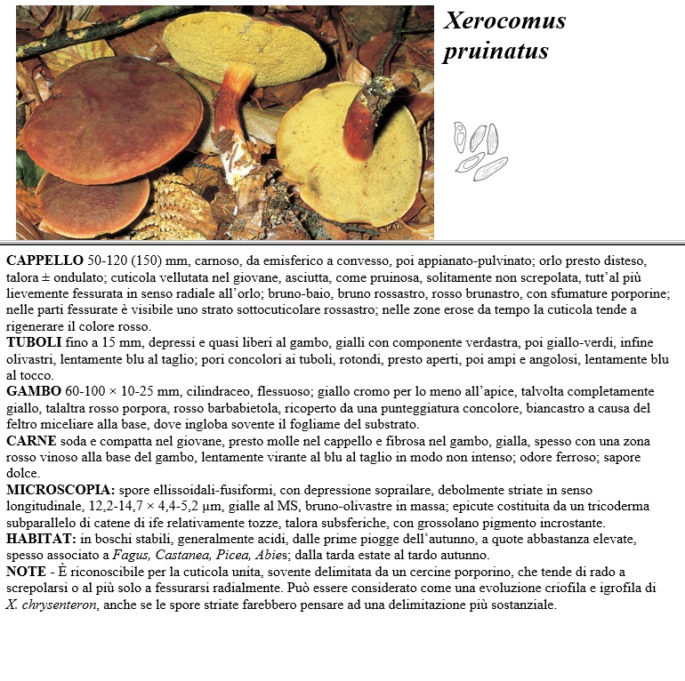 CAPPELLO 50-120 (150) mm, carnoso, da emisferico a convesso, poi appianato-pulvinato, orlo presto disteso, talora più o meno ondulato, cuticola vellutata nel giovane, asciutta come pruinosa, solitamente non screpolata, tutt'al più lievemente fessurata in senso radiale all'orlo, bruno-baio, bruno rossastro, rosso brunastro, con sfumature porporine, nelle parti fessurate è visibile uno strato sottocuticolare rossastro, nelle zone erose da tempo la cuticola tende a rigenerare il colore rosso. TUBOLI fino a 15 mm, depressi e quasi liberi al gambo, gialli con componente verdastra, poi giallo-verdi, infine olivastri, lentamente blu al taglio, pori concolori ai tuboli, rotondi, presto aperti, poi ampi e angolosi, lentamente blu al tocco. GAMBO 60-100 x 10-25 mm, cilindraceo, flessuoso, giallo cromo per lo meno all'apice, talvolta completamente giallo, talaltra rosso porpora, rosso barbabietola, ricoperto da una punteggiatura concolore, biancastro a causa del feltro miceliare alla base, dove ingloba sovente il fogliame del substrato. CARNE soda e compatta nel giocane, presto molle nel cappello e fibrosa nel gambo, gialla, spesso con una zona rosso vinoso alla base del gambo, lentamente virante al blu al taglio in modo non intenso, odore ferroso, sapore dolce. MICROSCOPIA spore ellissoidali-fusiformi, con depressione soprailare, debolmente striate in senso longitudinale, 12,2-14,7 x 4,4-5,2 µm, gialle al MS, bruno-olivastre in massa, epicute costituita da un tricoderma subparallelo di catene di ife relativamente tozze, talora subsferiche, con grossolano pigmento incrostante. HABITAT in boschi stabili, generalmente acidi, dalle prime piogge dell'autunno, a quote abbastanza elevate, spesso associato a Fagus, Castanea, Picea, Abies, dalla tarda estate al tardo autunno. NOTE - E' riconoscibile per la cuticola unita, sovente delimitata da un cercine porporino, che tende di rado a screpolarsi o al più solo a fessurarsi radialmente. Può essere considerato come una evoluzione criofila e igrofila di X. chrysenteron, anche se le spore striate farebbero pensare ad una delimitazione più sostanziale.