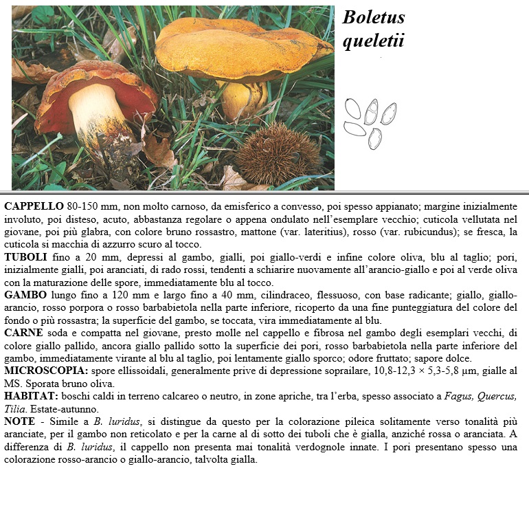 CAPPELLO 80-150 mm, non molto carnoso, da emisferico a concesso, poi spesso appianato, margine inizialmente involuto, poi disteso, acuto, abbastanza regolare o appena ondulato nell'esemplare vecchio, cuticola vellutata nel giovane, poi più glabra, con colore bruno rossastro, mattone (car. lateritius), rosso (var. rubicundus), se fresca, la cuticola si macchia di azzurro scuro al tocco. TUBOLI fino a 20 mm, depressi al gambo, gialli, poi giallo-verdi e infine colore olica, blu al taglio, pori, inizialmente gialli, poi aranciati, di rado rossi, tendenti a schiarire nuovamente all'arancio-giallo e poi al verde oliva con la maturazione delle spore, immediatamente blu al tocco. GAMBO lungo fino a 120 mm e largo fino a 40 mm, cilindraceo, flessuoso, con base radicante, giallo, siallo-arancio, rosso porpora o rosso barbabietola nella parte inferiore, ricoperto da una fine punteggiatura del colore del fondo o più rossastra, la superficie del gambo, se toccata, vira immediatamente al blu. CARNE soda e compatta nel giovane, presto molle nel cappello e fibrosa nel gambo degli esemplari vecchi, di colore giallo pallido, ancora giallo pallido sotto la superficie dei pori, rosso barbabietola nella parte inferiore del gambo, immediatamente virante al blu al taglio, poi lentamente giallo sporco, odore fruttato, sapore dolce. MICROSCOPIA spore ellissoidali, generalmente prive di depressione soprailare, 10,8-12,3 x5,3-5,8 µm, gialle al MS. Sporata bruno oliva. HABITAT boschi caldi in terreno calcareo o neutro, in zone apriche, tra l'erba, spesso associato a Fagus, Quercus, Tilia. Estate-autunno. NOTE - Simile a B. luridus, si distingue da questo per la colorazione pileica solitamente verso tonalità più aranciate, per il gambo non reticolato e per la carne al di sotto dei tuboli che è gialla, anziché rossa o aranciata. A differenza di B. luridus, il cappello non presenta mai tonalità verdognole innate. I pori presentano spesso una colorazione rosso-arancio o giallo-arancio, talvolta gialla.
