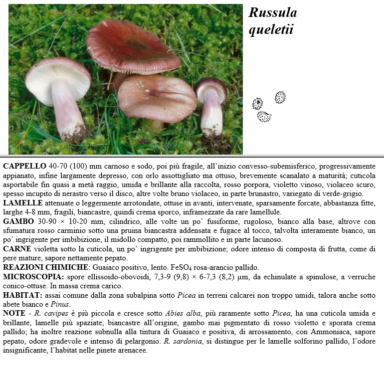 CAPPELLO 40-70 (100) mm carnoso e sodo; poi più fragile, all'inizio convesso-subemisferico; progressivamente appianato, infine largamente depresso, con orlo assottigliato ma ottuso, brevemente scanalato a maturità; cuticola asportabile fin quasi a metà raggio, umida e brillante alla raccolta, rosso porpora violetto cinoso, violaceo scuro; spesso incupito di nerastro verso il disco, altre volte bruno ciolaceo; in parte brunastro, variegato di verde-grigio. LAMELLE attenuate o leggermente arrotondate, ottuse in acanti, intervenate, sparsamente forcate, abbastanza fitte; larghe 4-8 mm, fragili, biancastre, quindi crema sporco, inframezzate da rare lamellule. GAMBO 30-90 x 10-20 mm, cilindrico; alle volte un po' fusiforme, rugoloso, bianco alla base; altrove con sfumatura rosso carminio sotto una pruina biancastra addensata e fugace al tocco, talvolta interamente bianco, un po' ingrigente per imbibizione, il midollo compatto, poi rammollito e in parte lacunoso. CARNE violetta sotto la cuticola, un po' ingrigente per imbibizione; odore intenso di composta di frutta, come di pere mature, sapore nettamente pepato. REAZIONI CHIMICHE Guaiaco positivo, lento. FeSO4 rosa-arancio pallido. MICROSCOPIA spore ellissoido-obovoidi, 7,3-9 (9,8) x 6-7,3 (8,2) µm, da echinulate a spinulose; a verruche conico-ottuse. In massa crema carico. HABITAT: assai comune dalla zona subalpina sotto Picea in terreni calcarei non troppo umidi; talora anche sotto abete bianco e Pinus. NOTE - R. cavipes è più piccola e cresce sotto Abies alba, più raramente sotto Picea, ha una cuticola umida e brillante, lamelle più spaziate, biancastre all'origine, gambo mai pigmentato di rosso violetto e sporata crema pallido; ha inoltre reazione subnulla alla tintura di Guaiaco e positiva, di arrossamento, con Ammoniaca, sapore pepato; odore gradevole e intenso di pelargonio. R. sardonia, si distingue per le lamelle solforino pallido, l'odore insignificante. l'habitat nelle pinete arenacee.