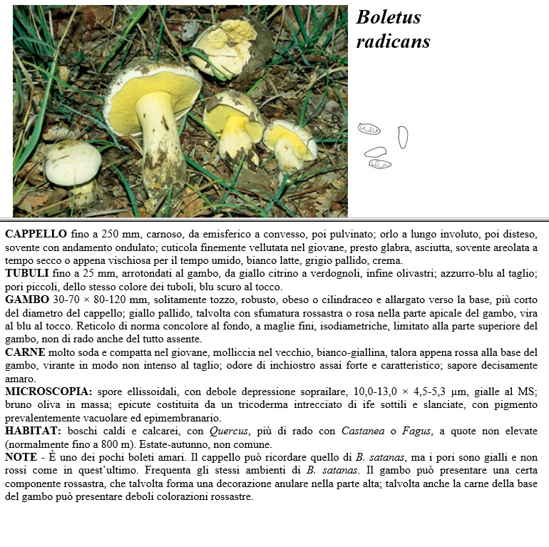 CAPPELLO fino a 250 mm, carnoso, da emisferico a coneesso, poi pulvinato, orlo a lungo involuto, poi disteso, sovente con andamento ondulato, cuticola finemente vellutata nel giocane, presto glabra, asciutta, sovente areolata a tempo secco o appena vischiosa per il tempo umido, bianco latte, grigio pallido, crema. TUBULI fino a 25 mm, arrotondati al gambo, da giallo citrino a verdognoli, infine olivastri, azzurro-blu al taglio, pori piccoli, dello stesso colore dei tuboli, blu scuro al tocco. GAMBO 30-70 x 80-120 mm, solitamente tozzo, robusto, obeso o cilindraceo e allargato verso la base, più corto del diametro del cappello, giallo pallido, talvolta con sfumatura rossastra o rosa nella parte apicale del gambo, vira al blu al tocco. Reticolo di norma concolore al fondo, a maglie fini, isodiametriche, limitato alla parte superiore del gambo, non di rado anche del tutto assente. CARNE molto soda e compatta nel giovane, molliccia nel vecchio, bianco-giallina, talora appena rossa alla base del gambo, virante in modo non intenso al taglio, odore di inchiostro assai forte e caratteristico, sapore decisamente amaro. MICROSCOPIA spore ellissoidali, con debole depressione soprailare, 10,0-13,0 x 4,5-5,3 µm, gialle al MS, bruno oliva in massa, epicute costituita da un tricoderma intrecciato di ife sottili e slanciate, con pigmento prevalentemente vacuolare ed epimembranario. HABITAT boschi caldi e calcarei, con Quercus, più di rado con Castanea o Fagus, a quote non elevate (normalmente fino a 800 m). Estate-autunno, non comune. NOTE - E uno dei pochi boleti amari. Il cappello può ricordare quello di B. satanas, ma i pori sono gialli e non rossi come in quest'ultimo. Frequenta gli stessi ambienti di B. satanas. Il gambo può presentare una certa componente rossastra, che talvolta forma una decorazione anulare nella parte alta, talvolta anche la carne della base del gambo può presentare deboli colorazioni rossastre.